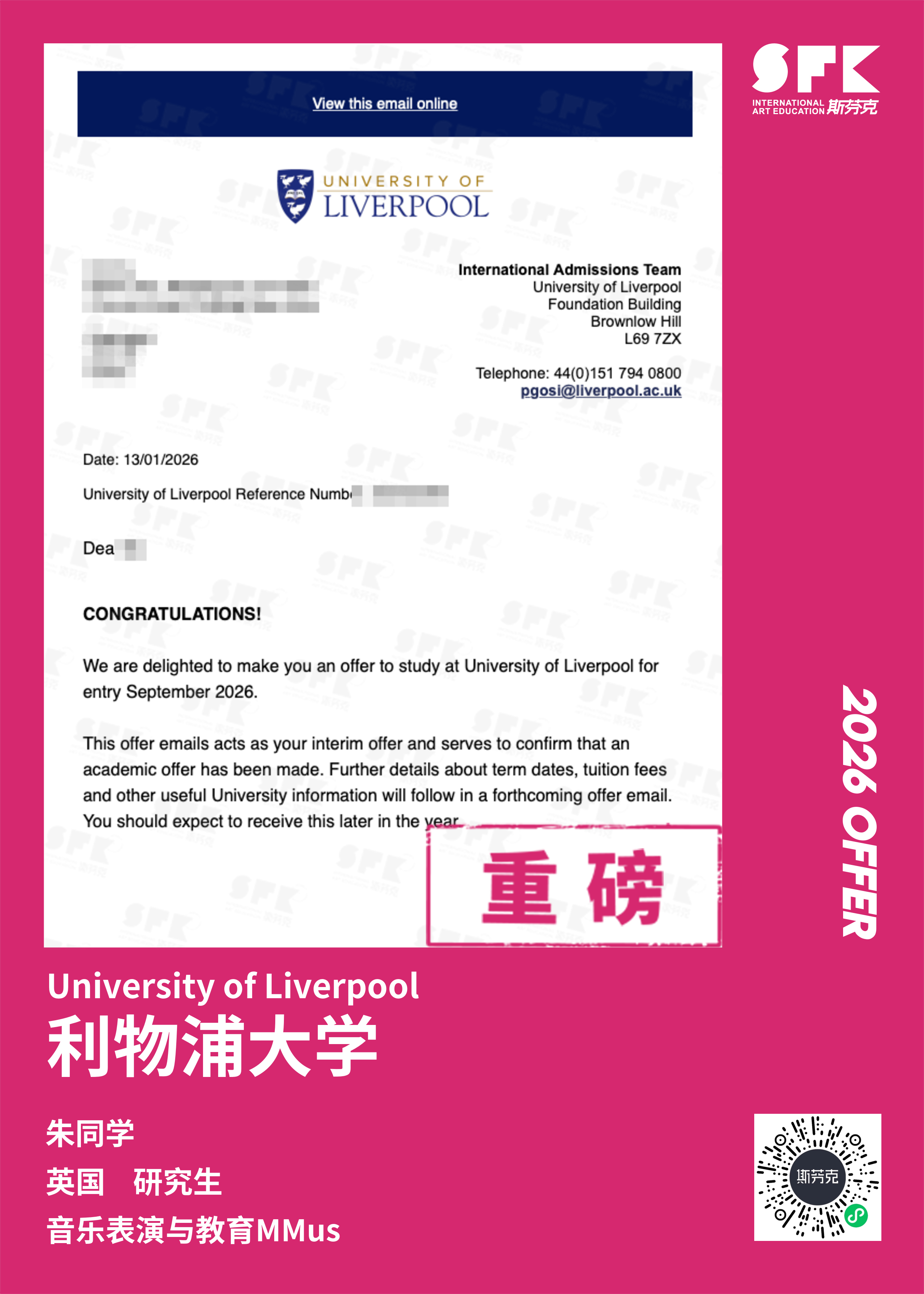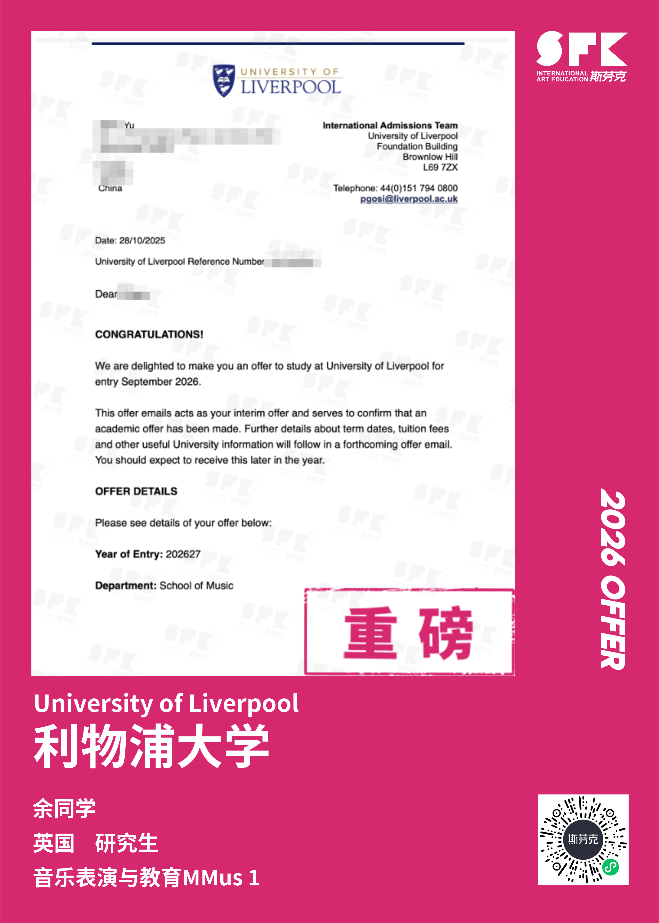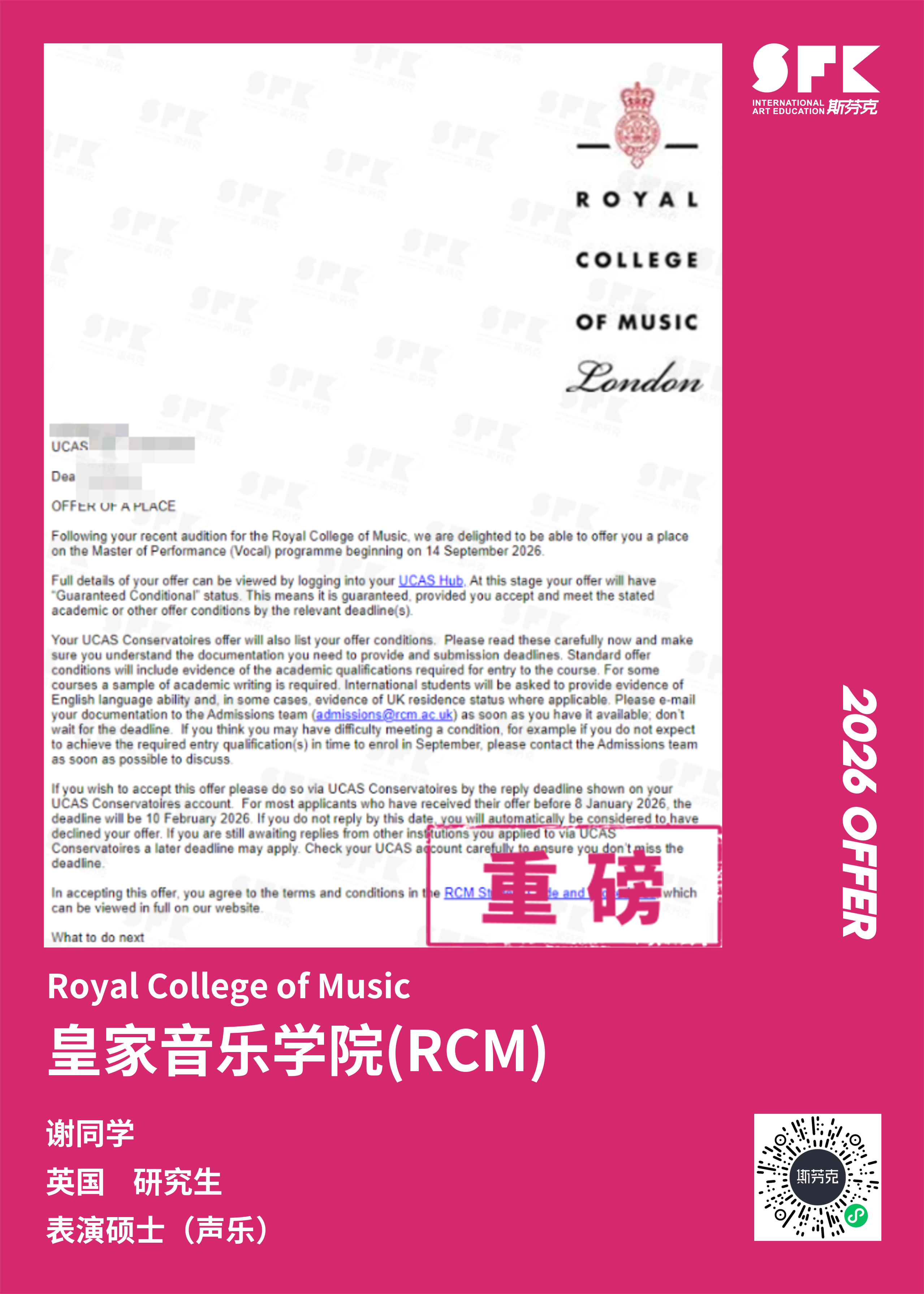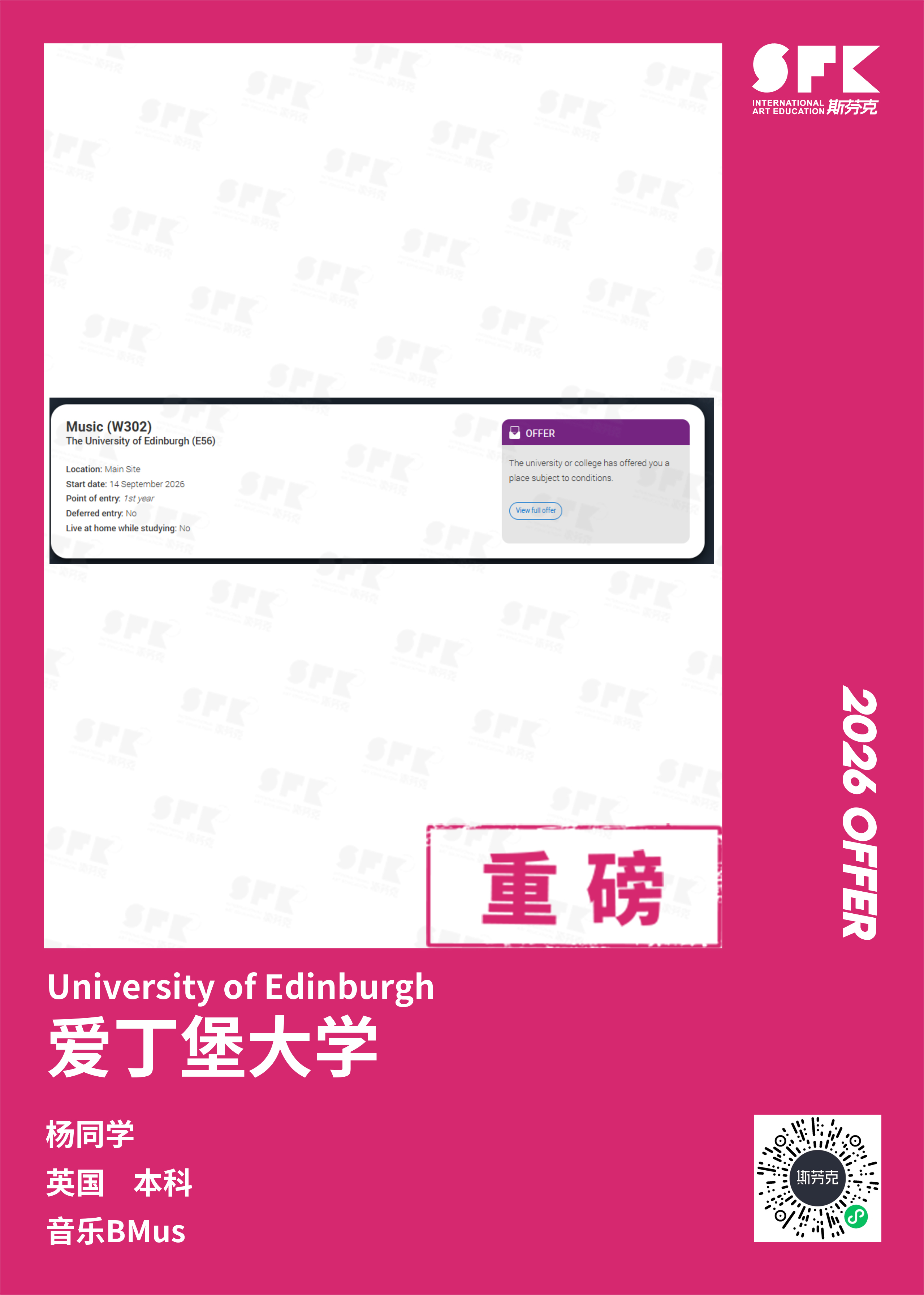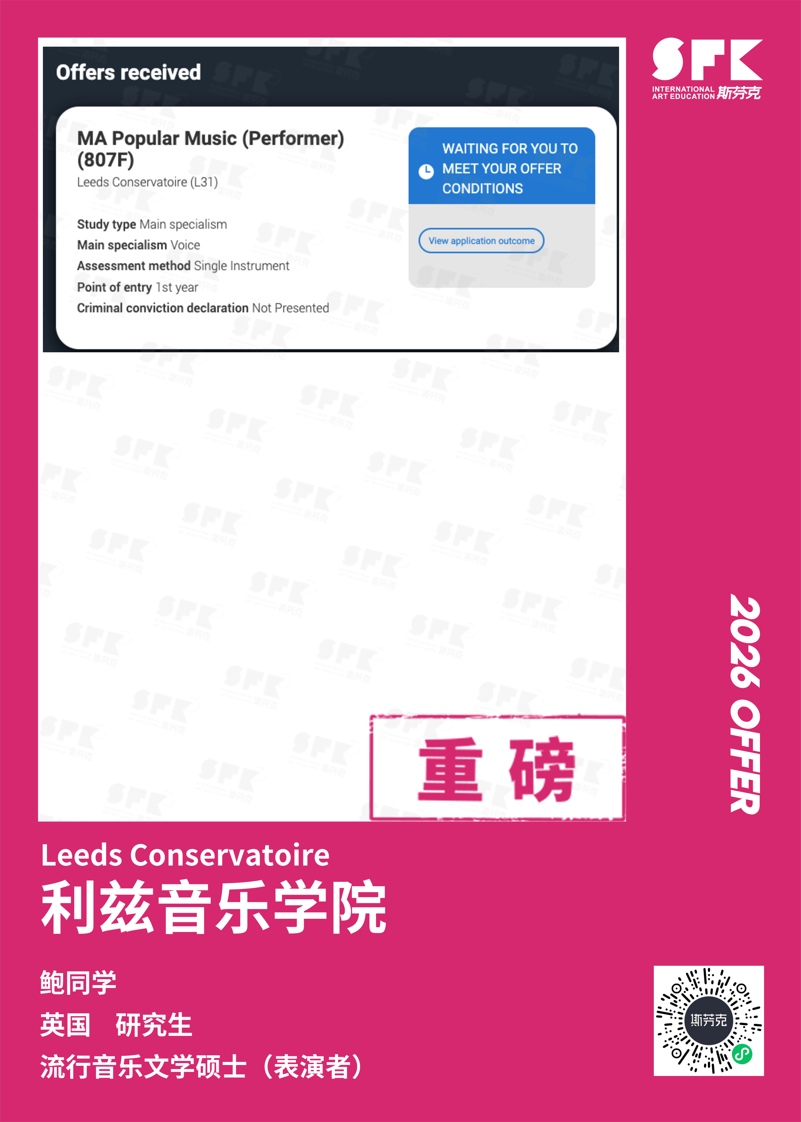 学生背景:MiraclE 22申请季 音乐科系学员 目前录取院校:皇家伯明翰音乐学院,约翰霍普金斯大学,爱丁堡大学,威斯敏斯特大学,伦敦大学金史密斯学院