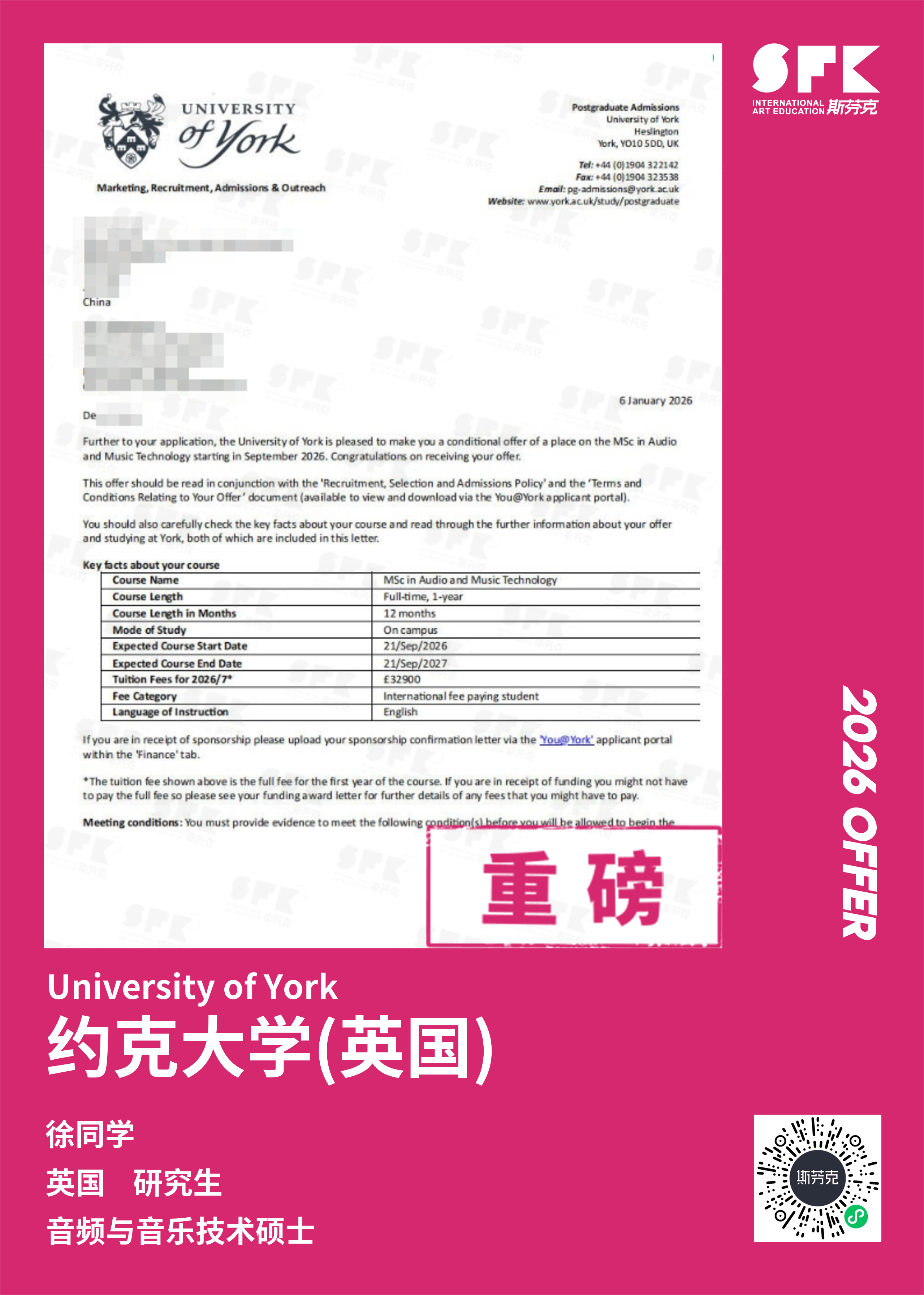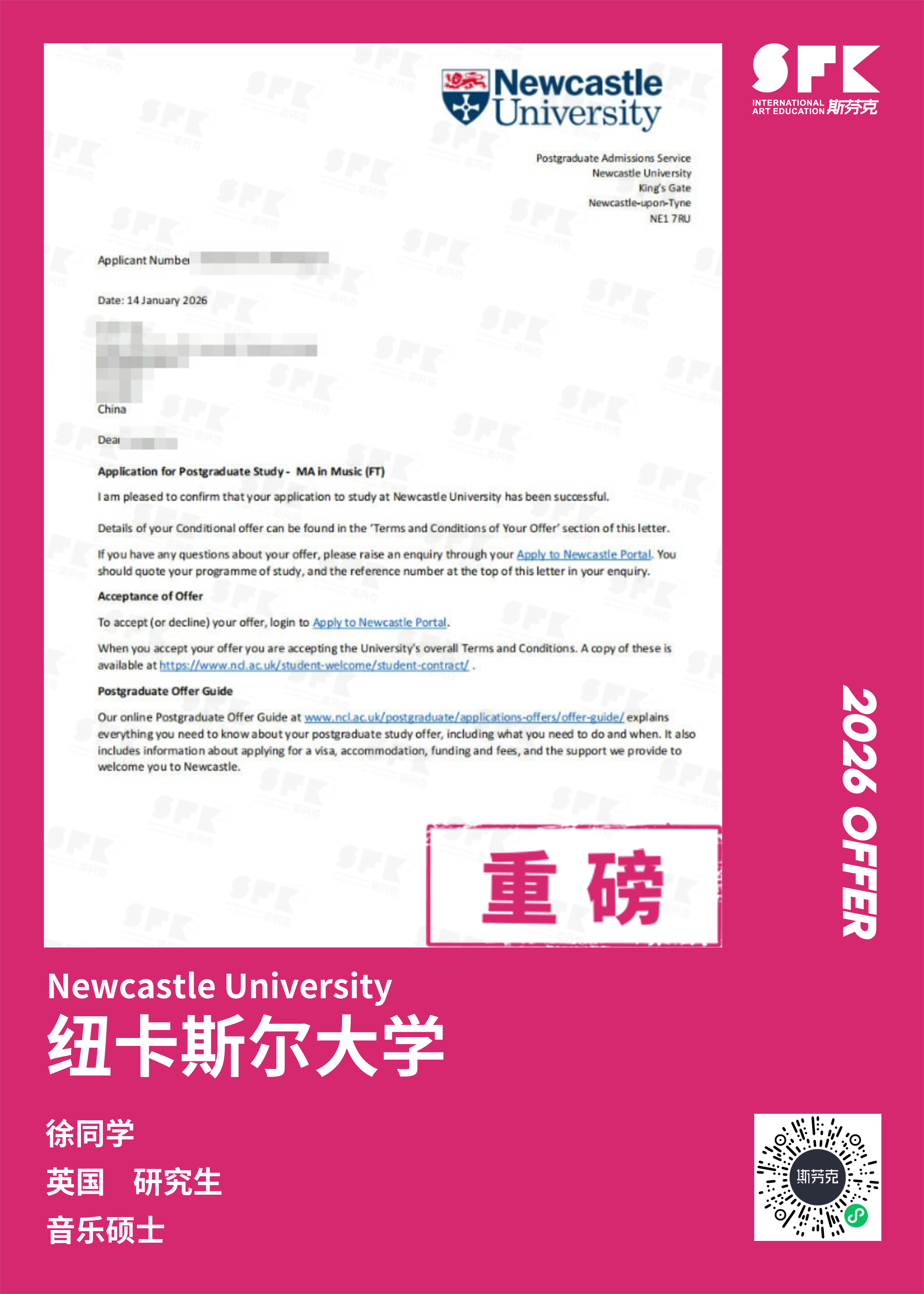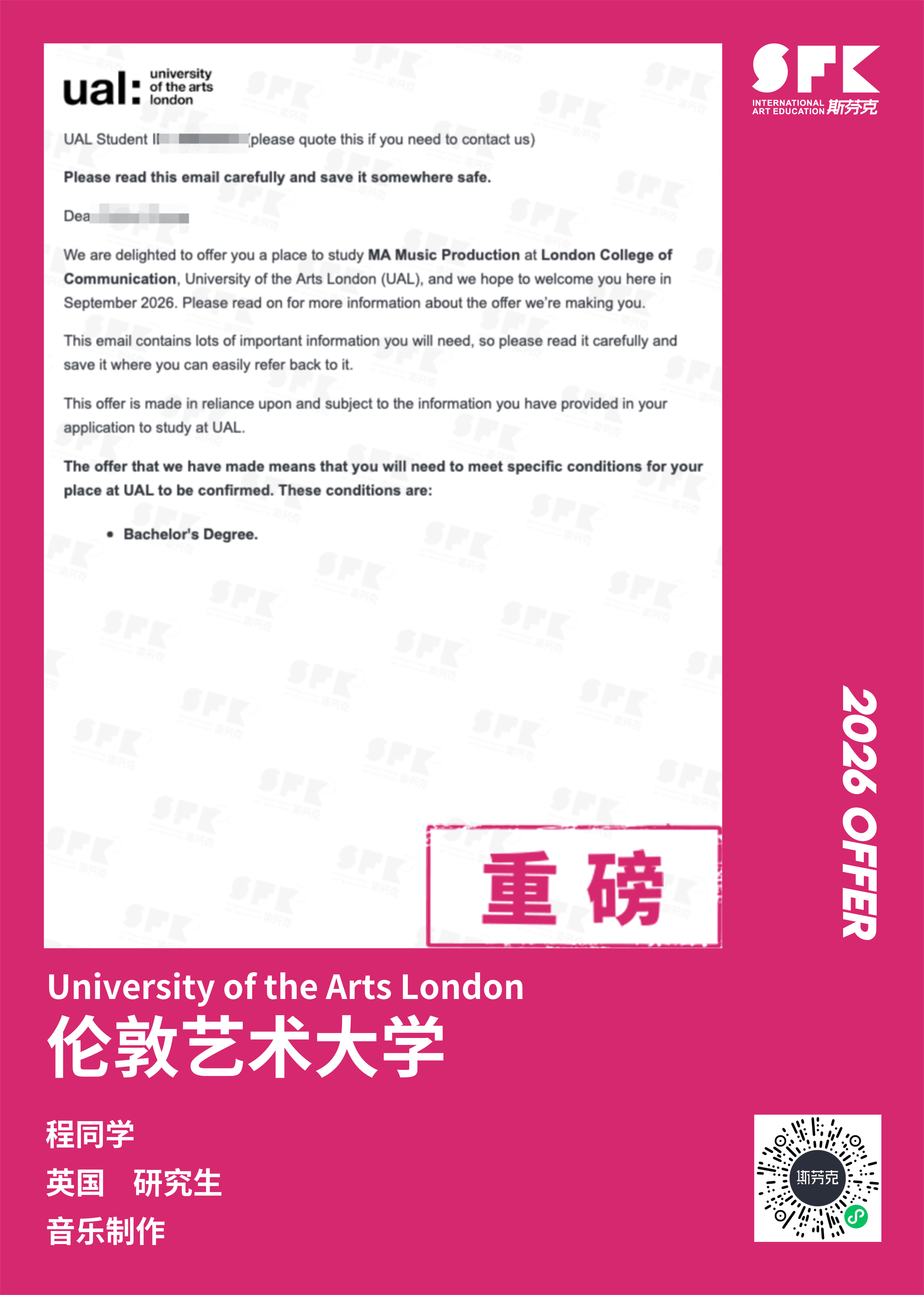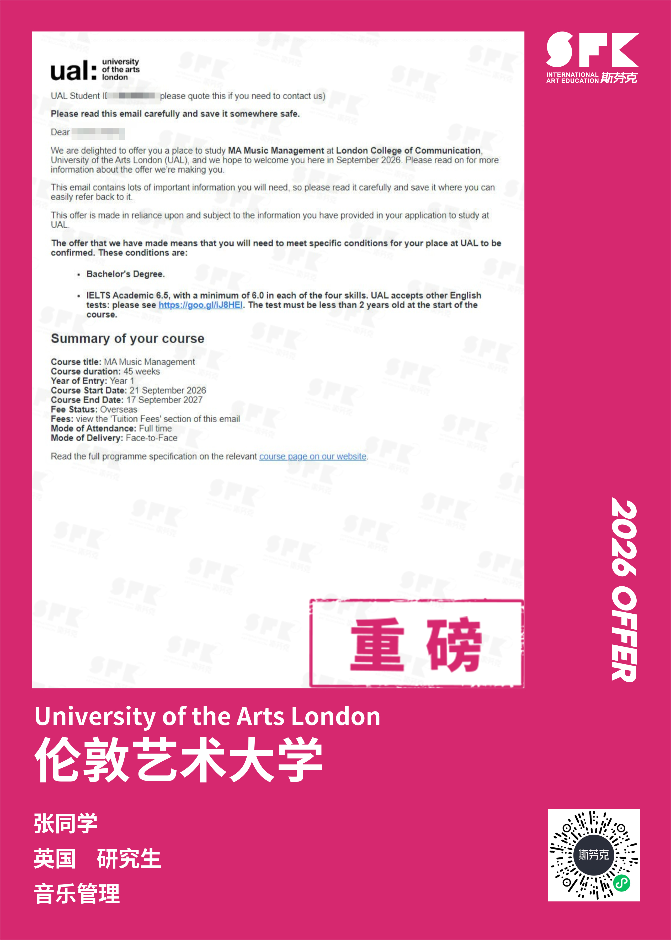 学生背景:MiraclE 22申请季 音乐科系学员 目前录取院校:皇家伯明翰音乐学院,约翰霍普金斯大学,爱丁堡大学,威斯敏斯特大学,伦敦大学金史密斯学院