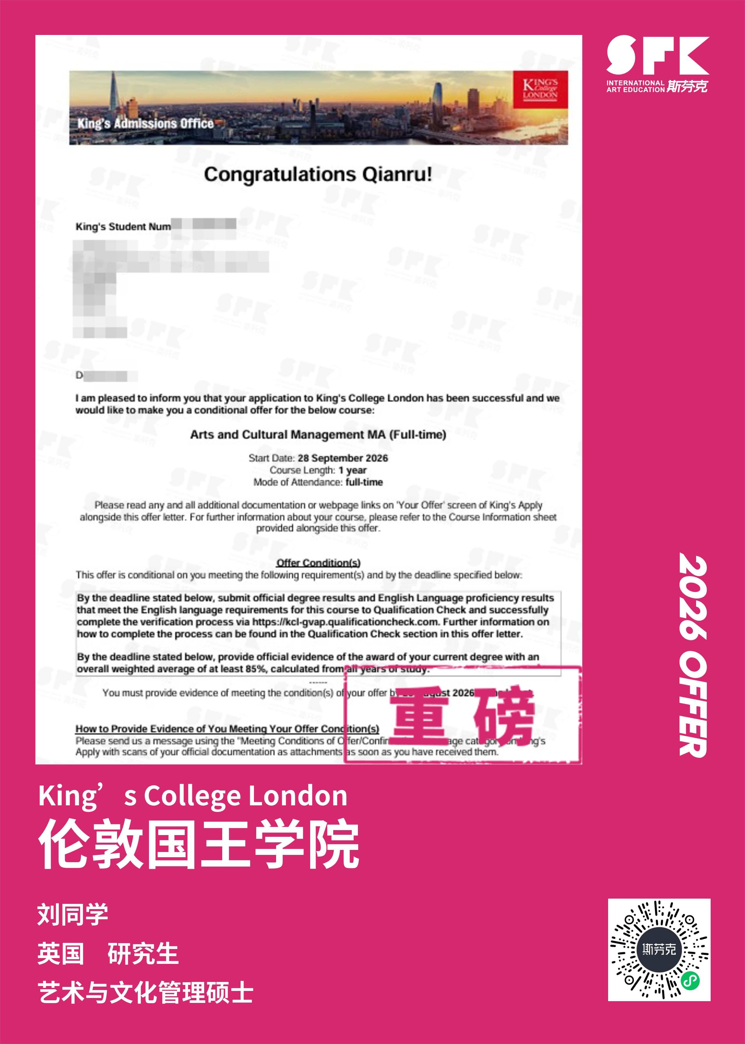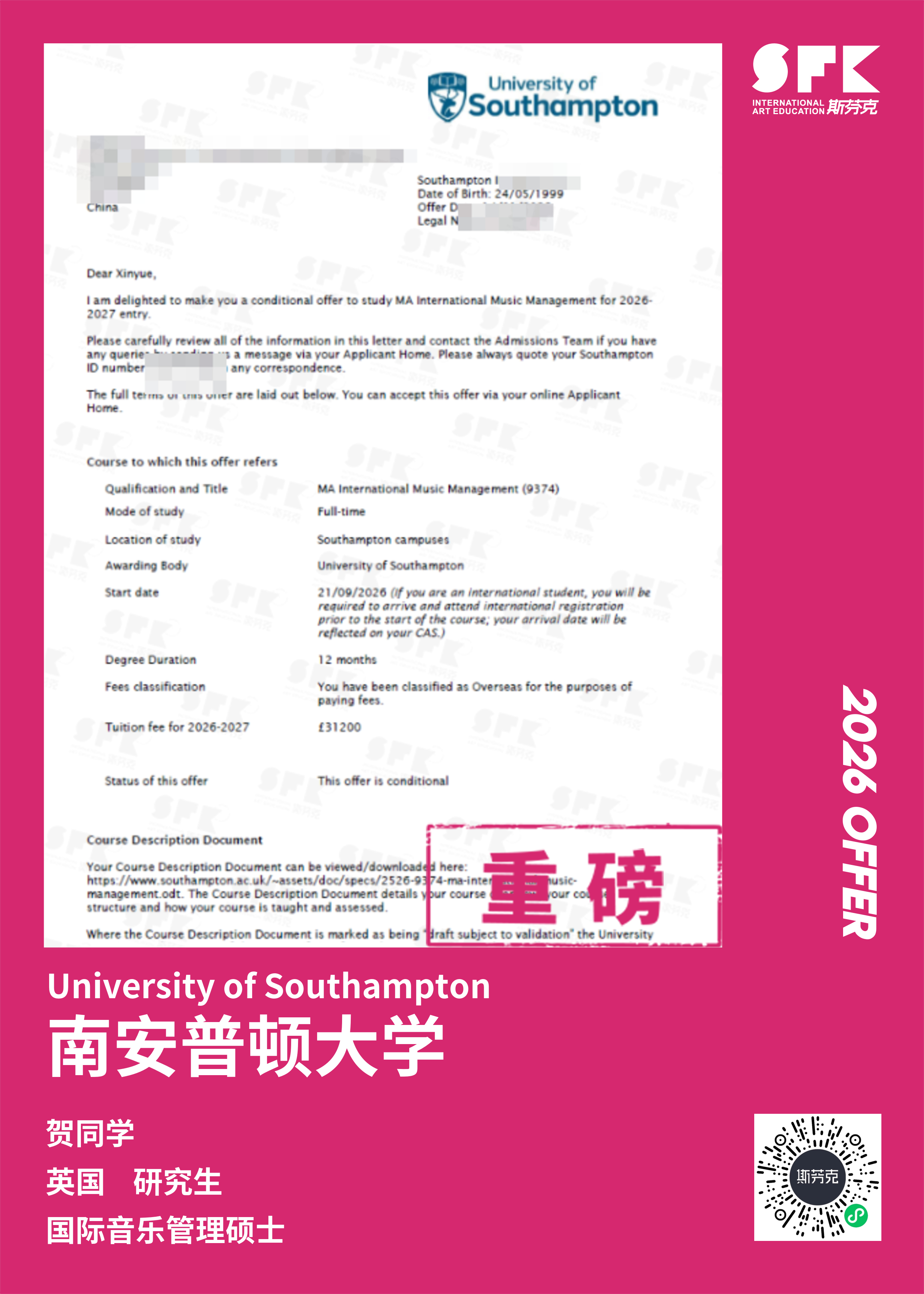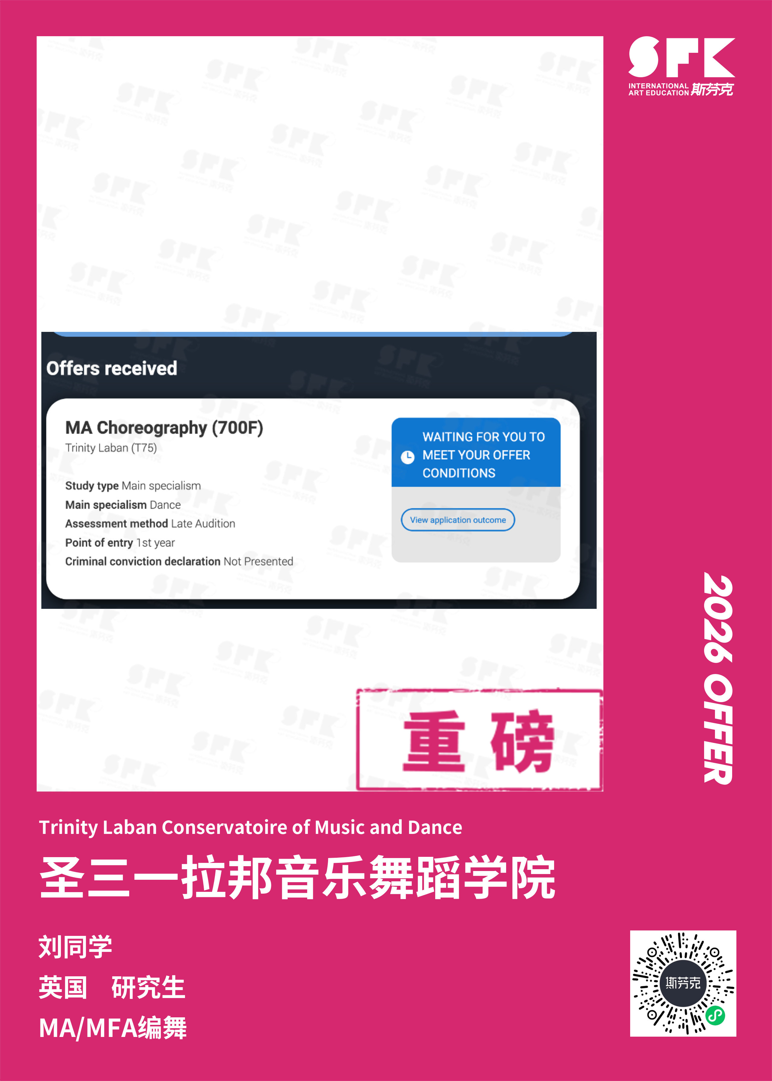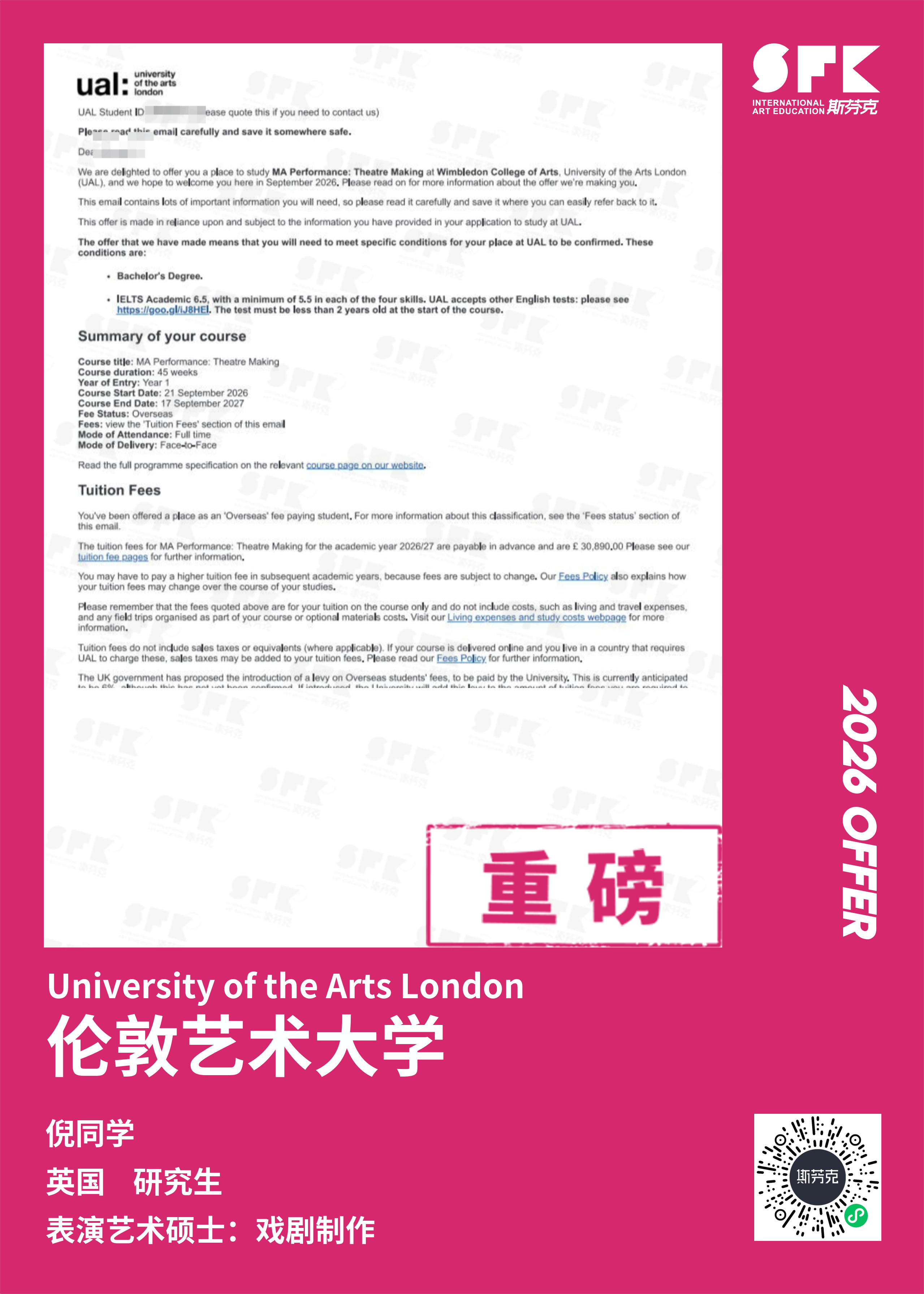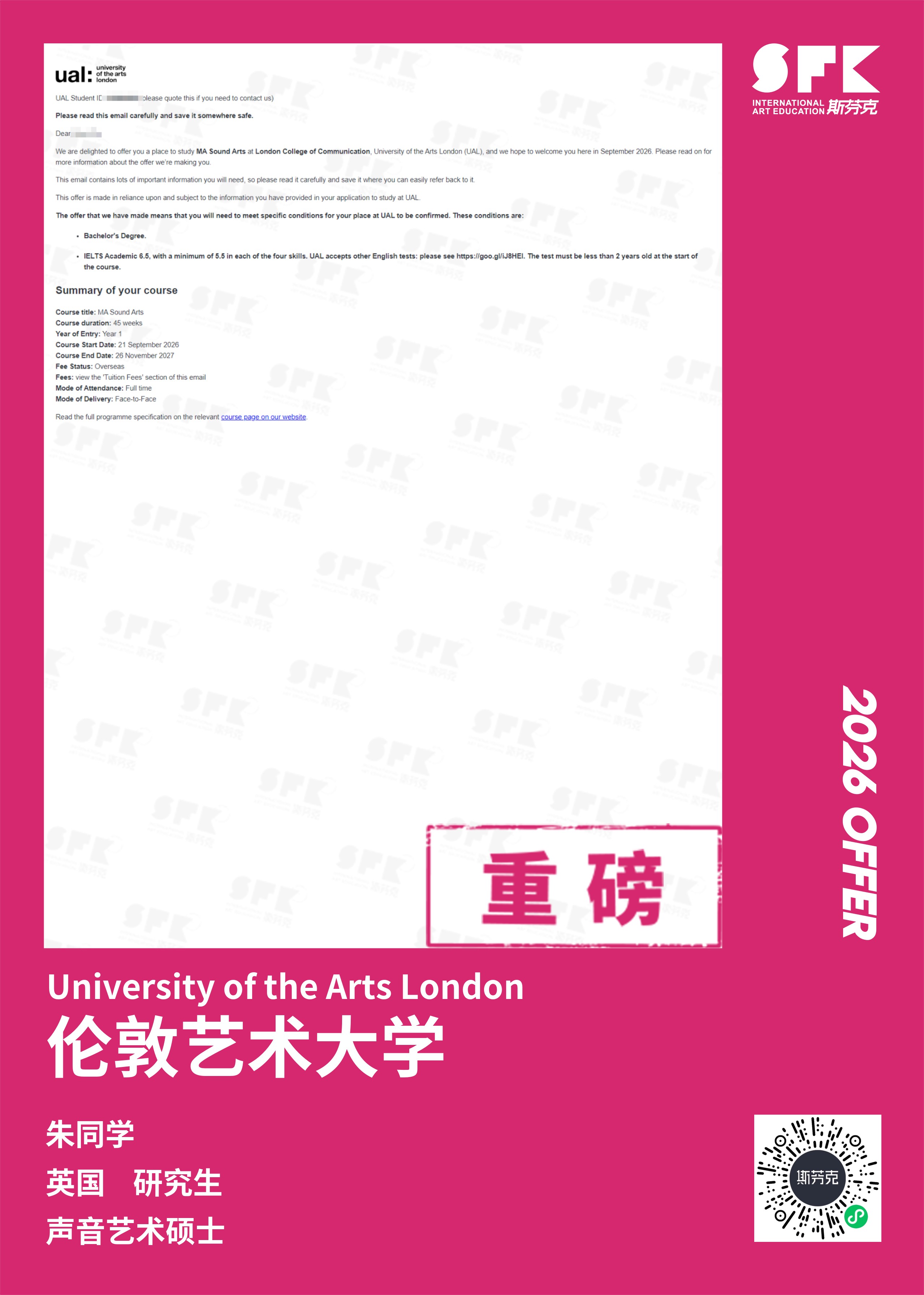 学生背景:MiraclE 22申请季 音乐科系学员 目前录取院校:皇家伯明翰音乐学院,约翰霍普金斯大学,爱丁堡大学,威斯敏斯特大学,伦敦大学金史密斯学院