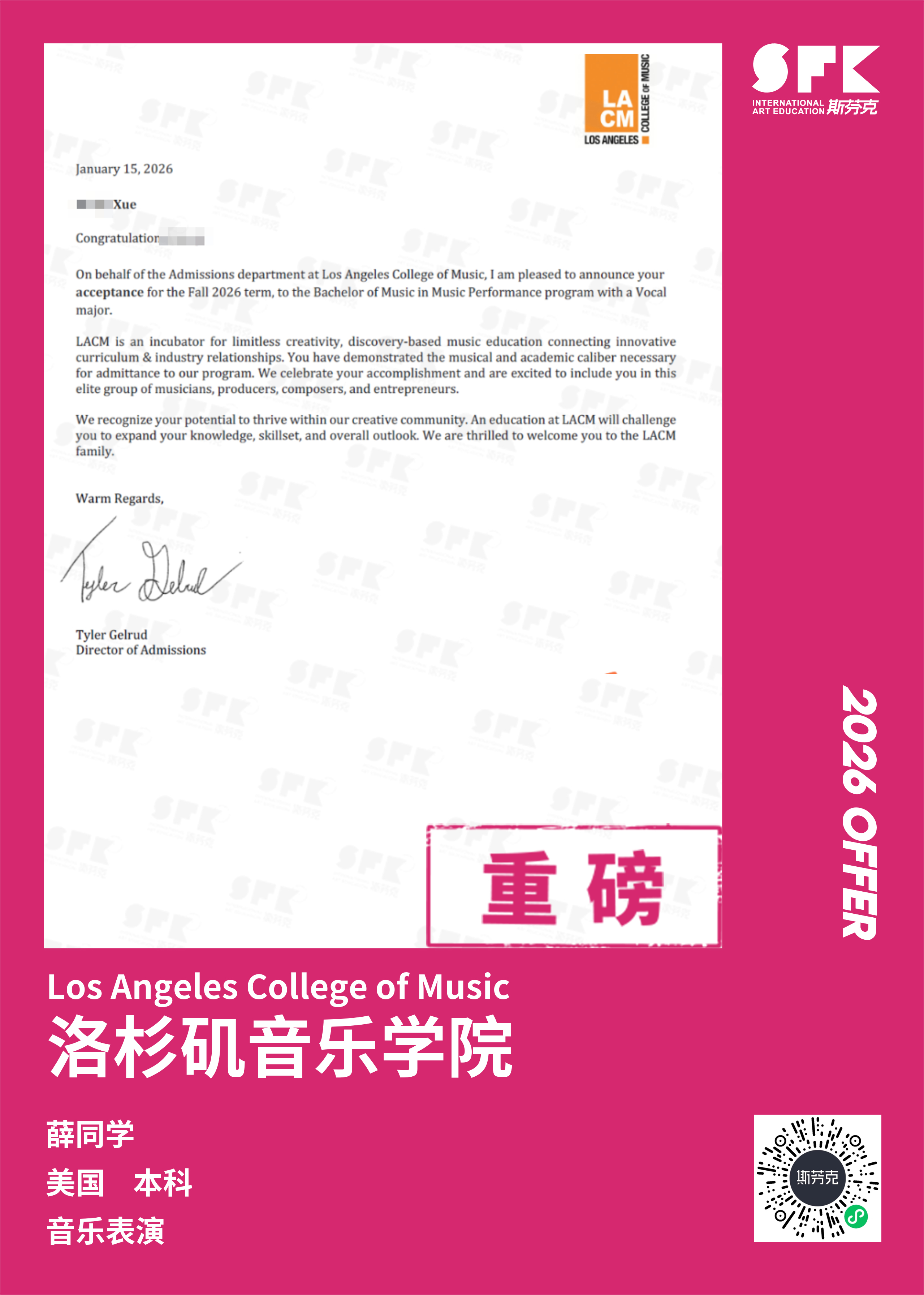 伯克利音乐学院考场外,吴同学在等待面试,心里还有些紧张。但面试结束后,他从容地走出考场,豁然开朗,对考试很有把握。几个月后,伯克利音乐学院放榜,他收到了这所顶尖音乐学院的offer,成了王力宏、欧阳娜娜的学弟,与王源同为2019届新生,一切如他所愿。