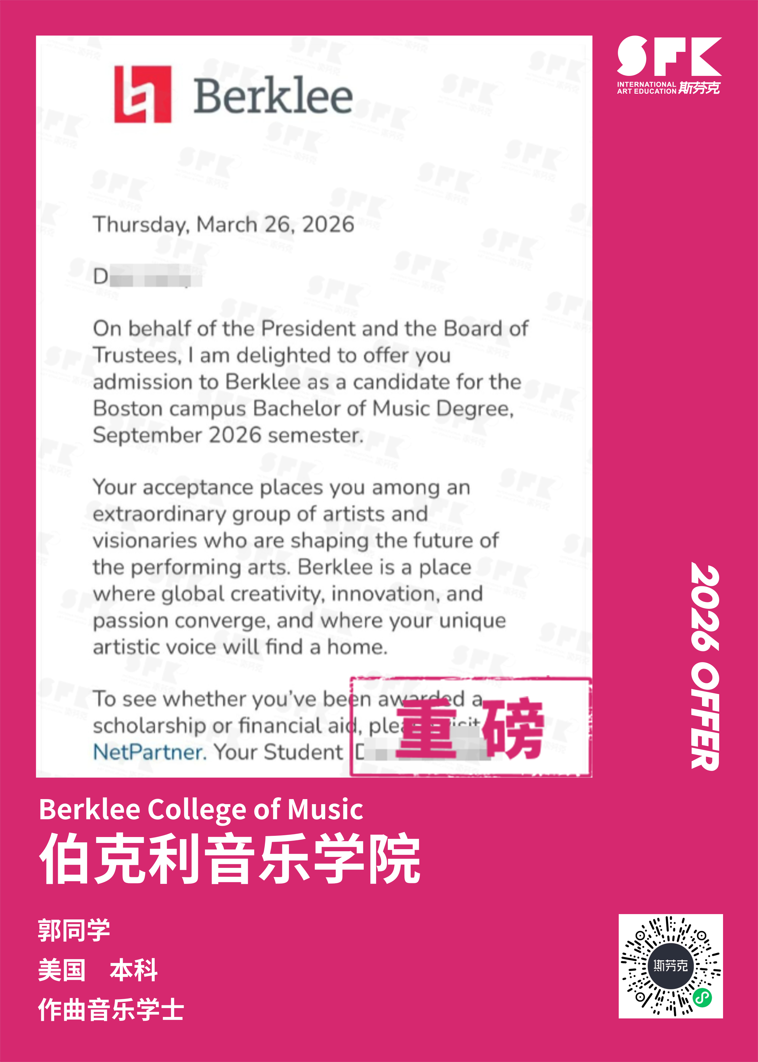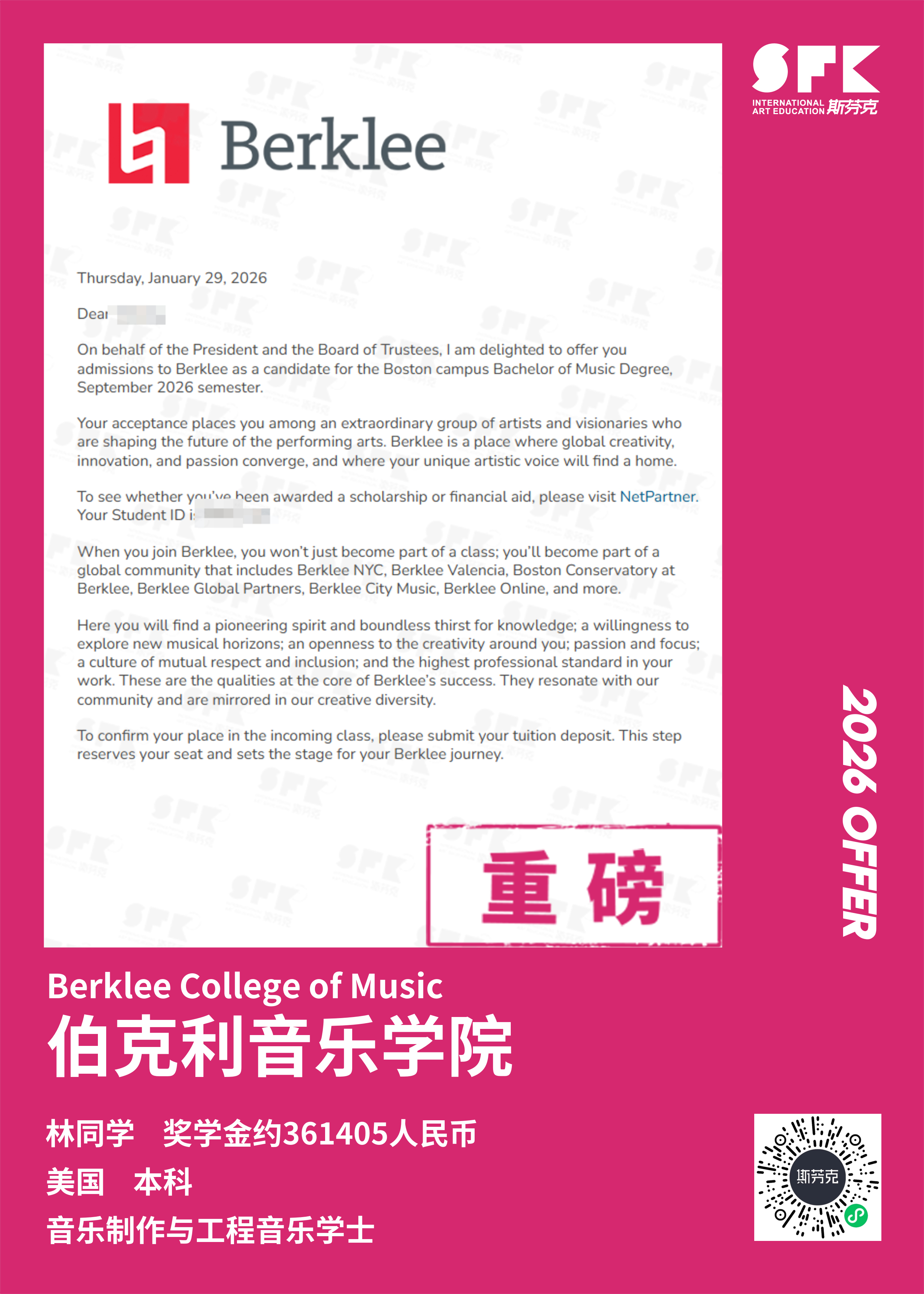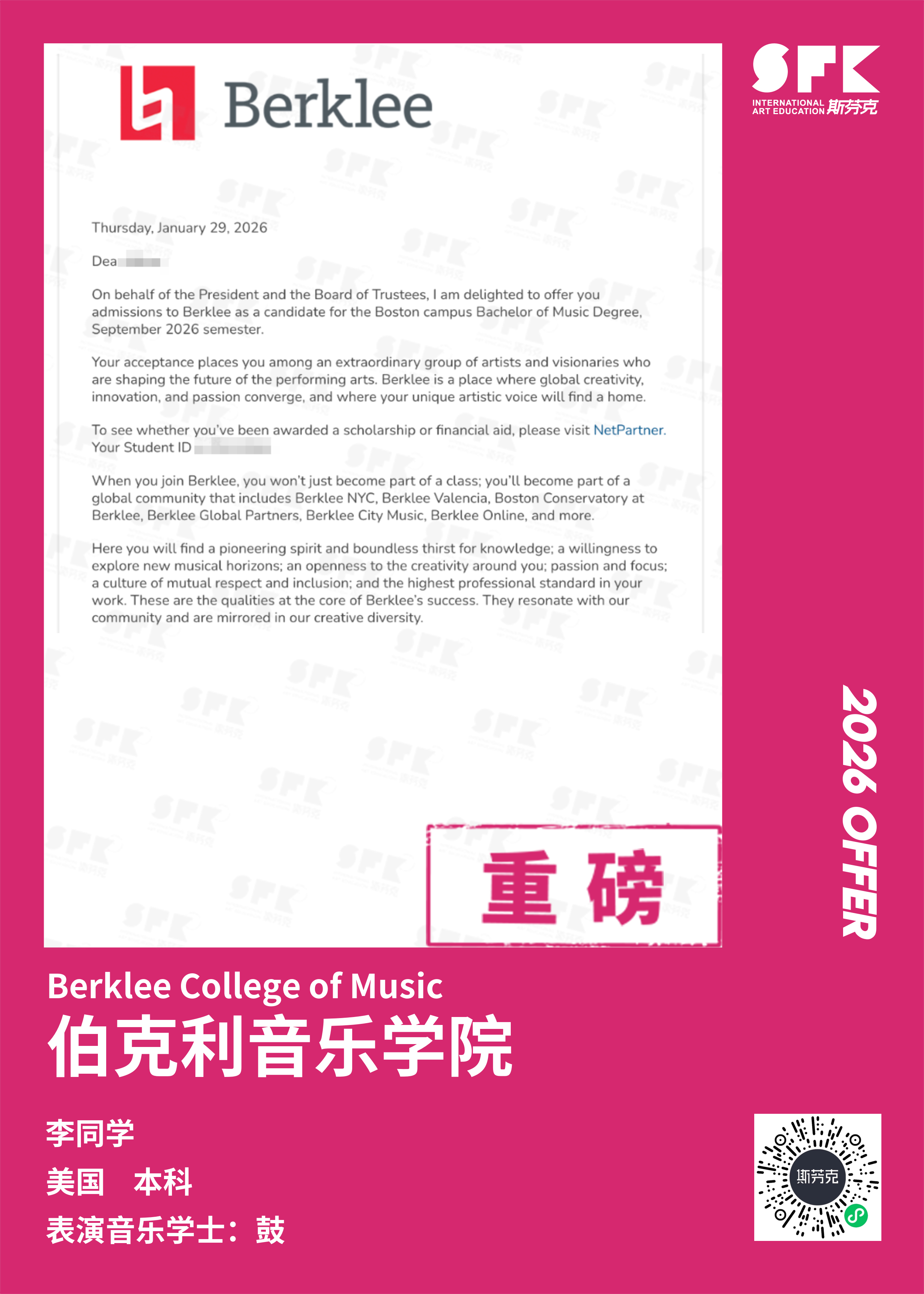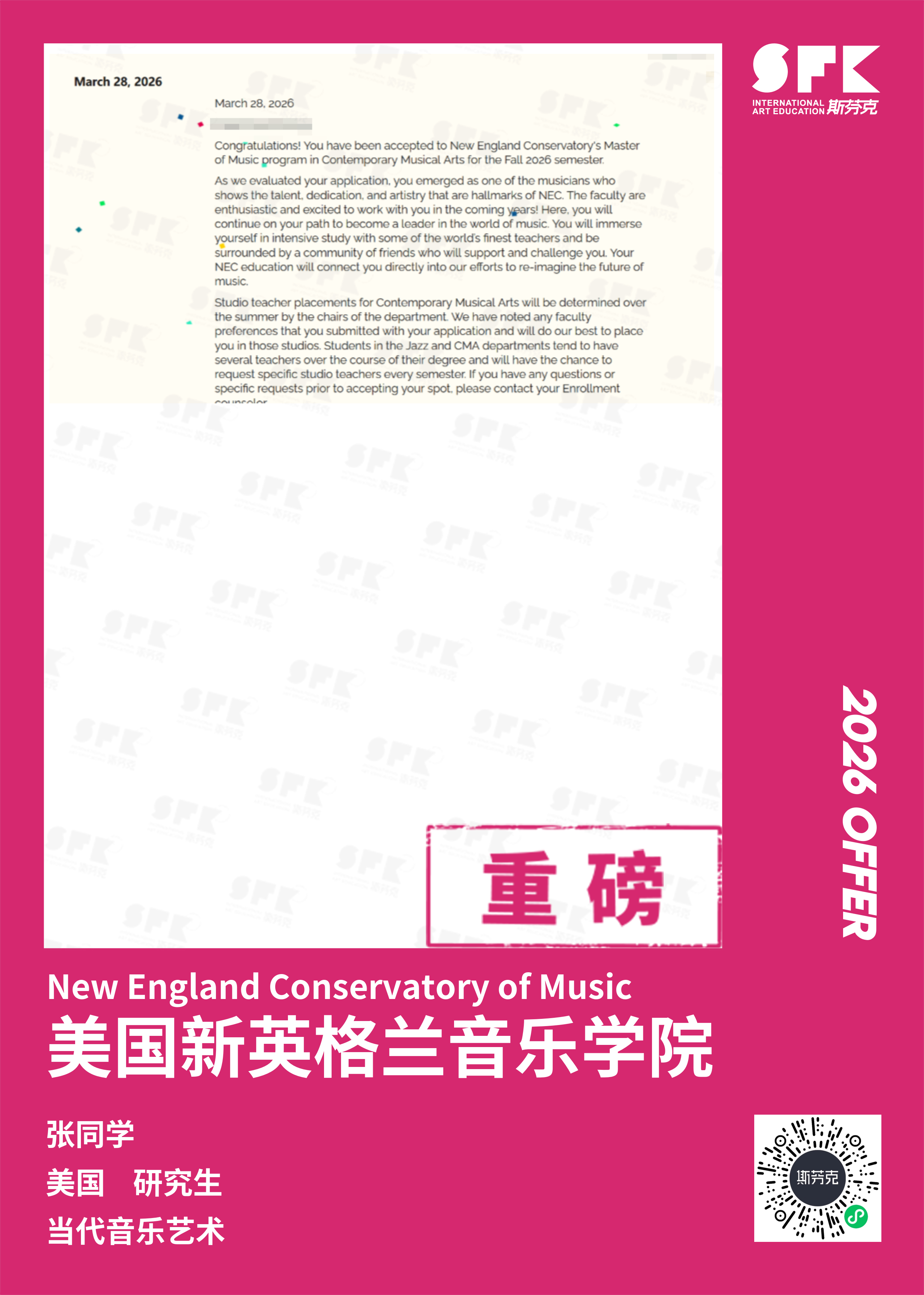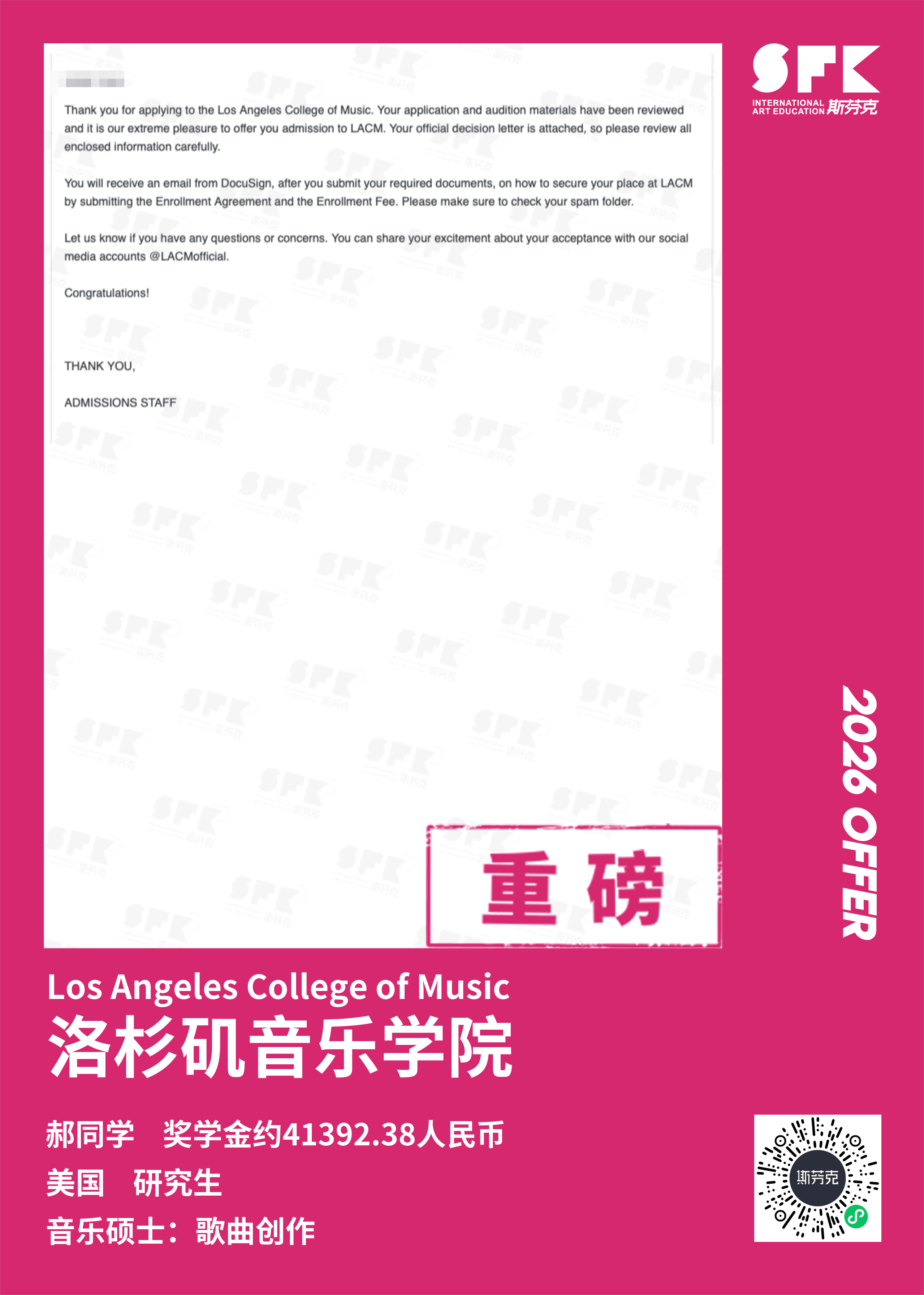 斯芬克音乐已帮助学员获得越来越多的国外音乐院校Offer