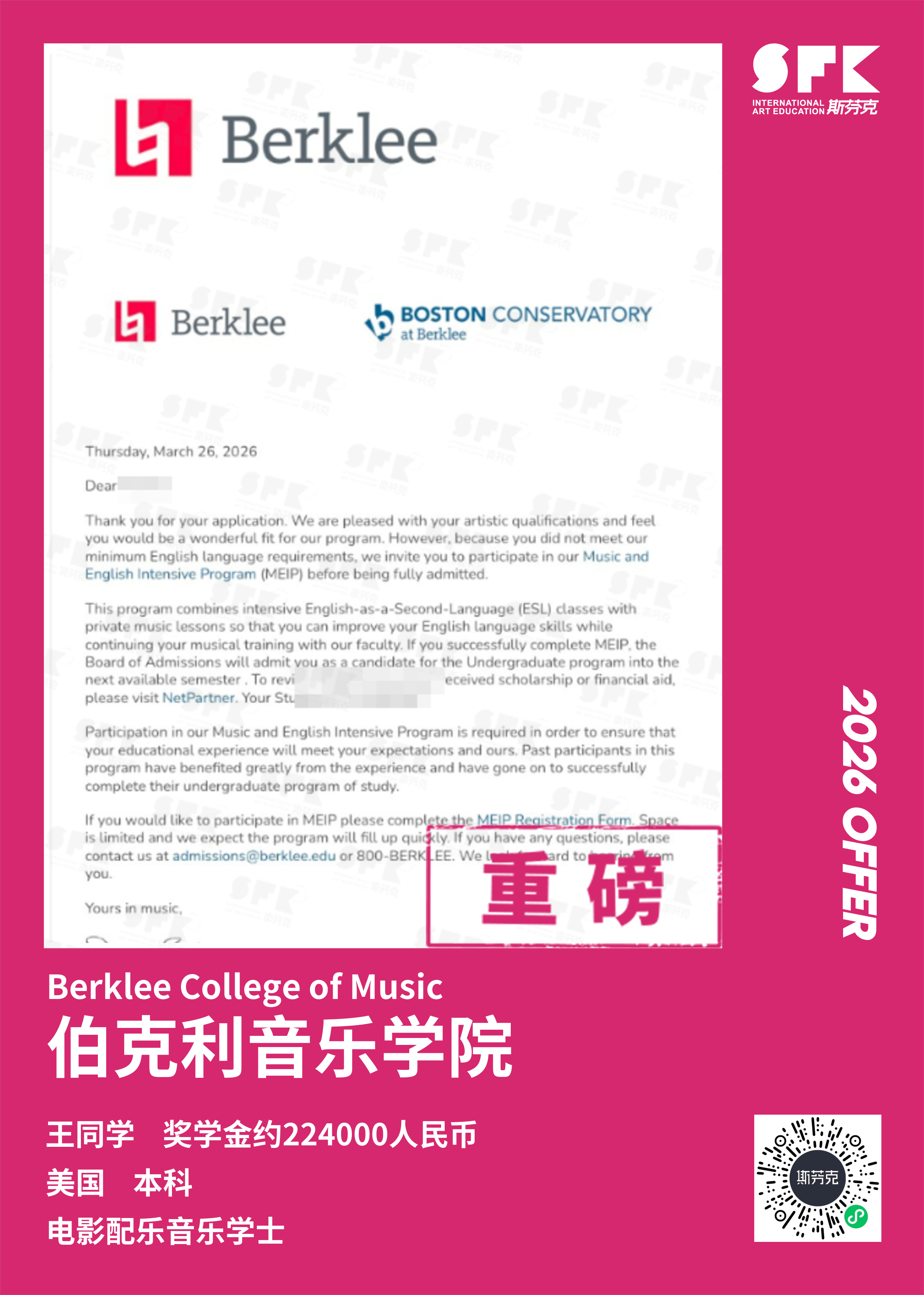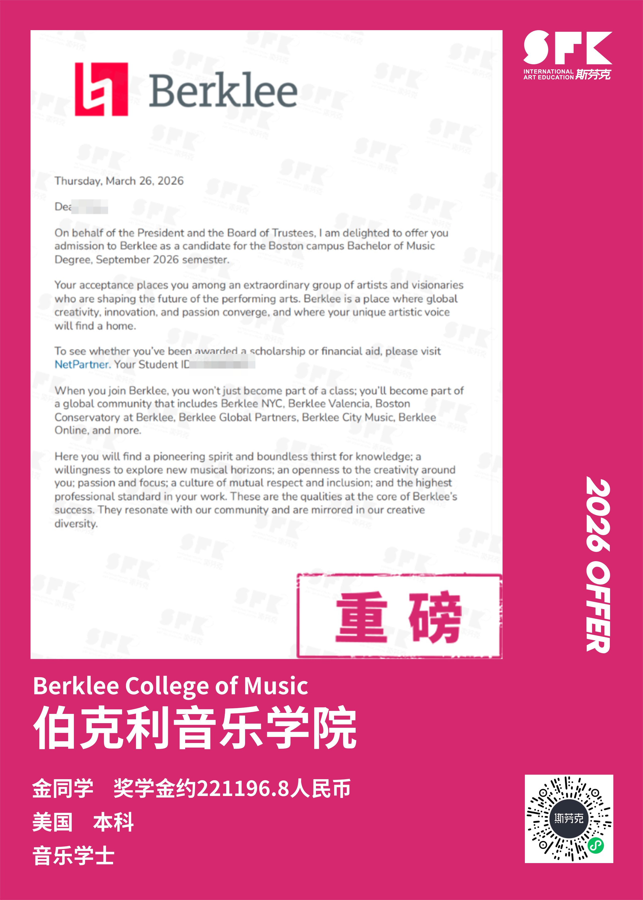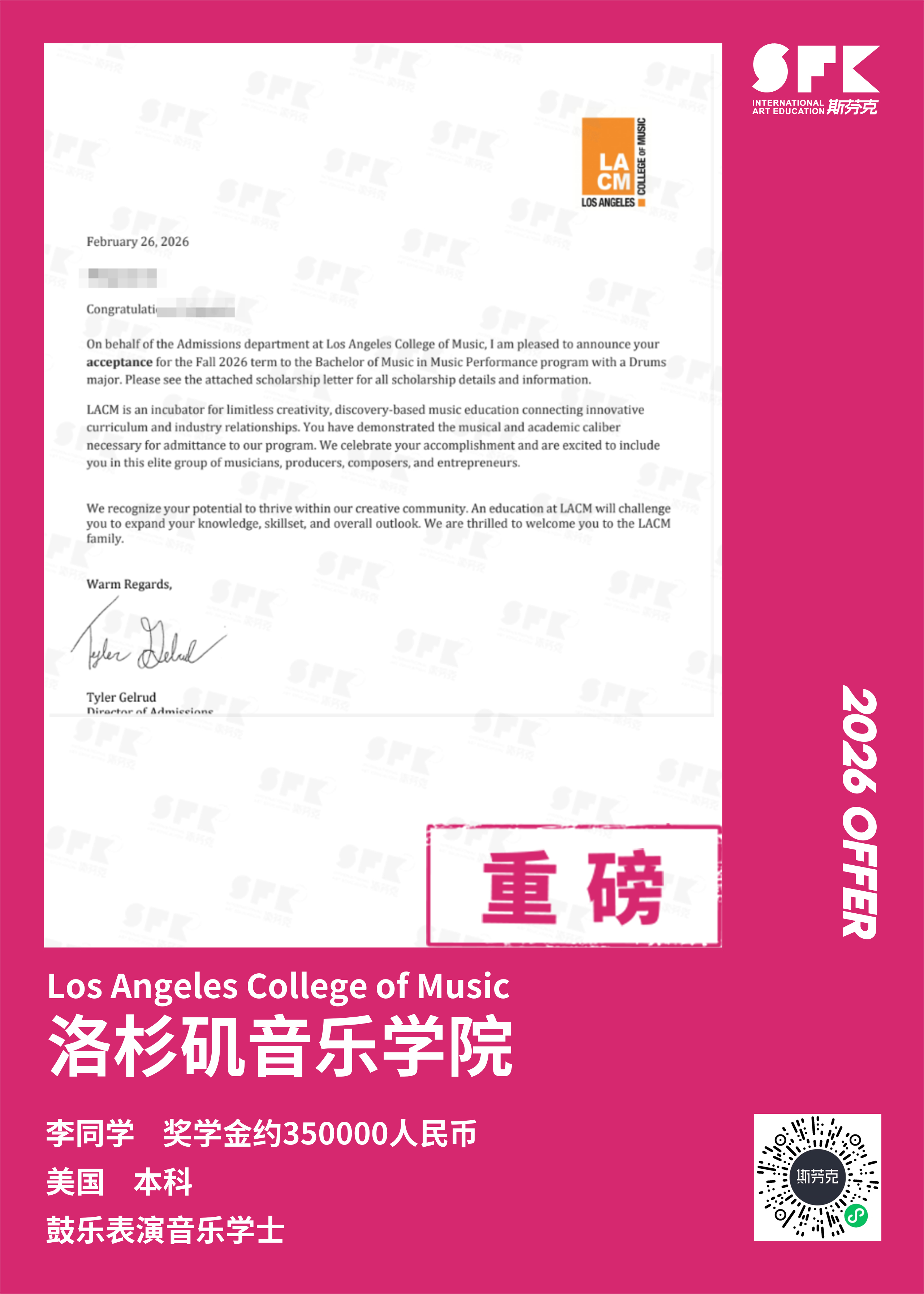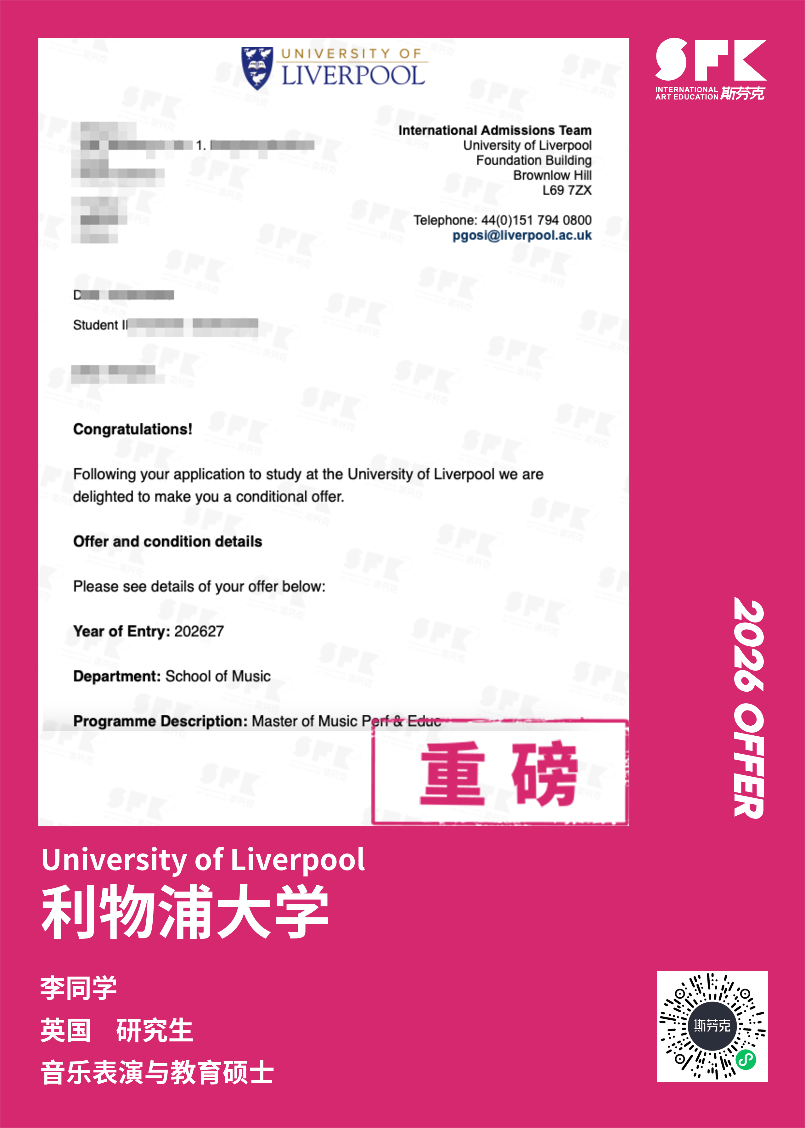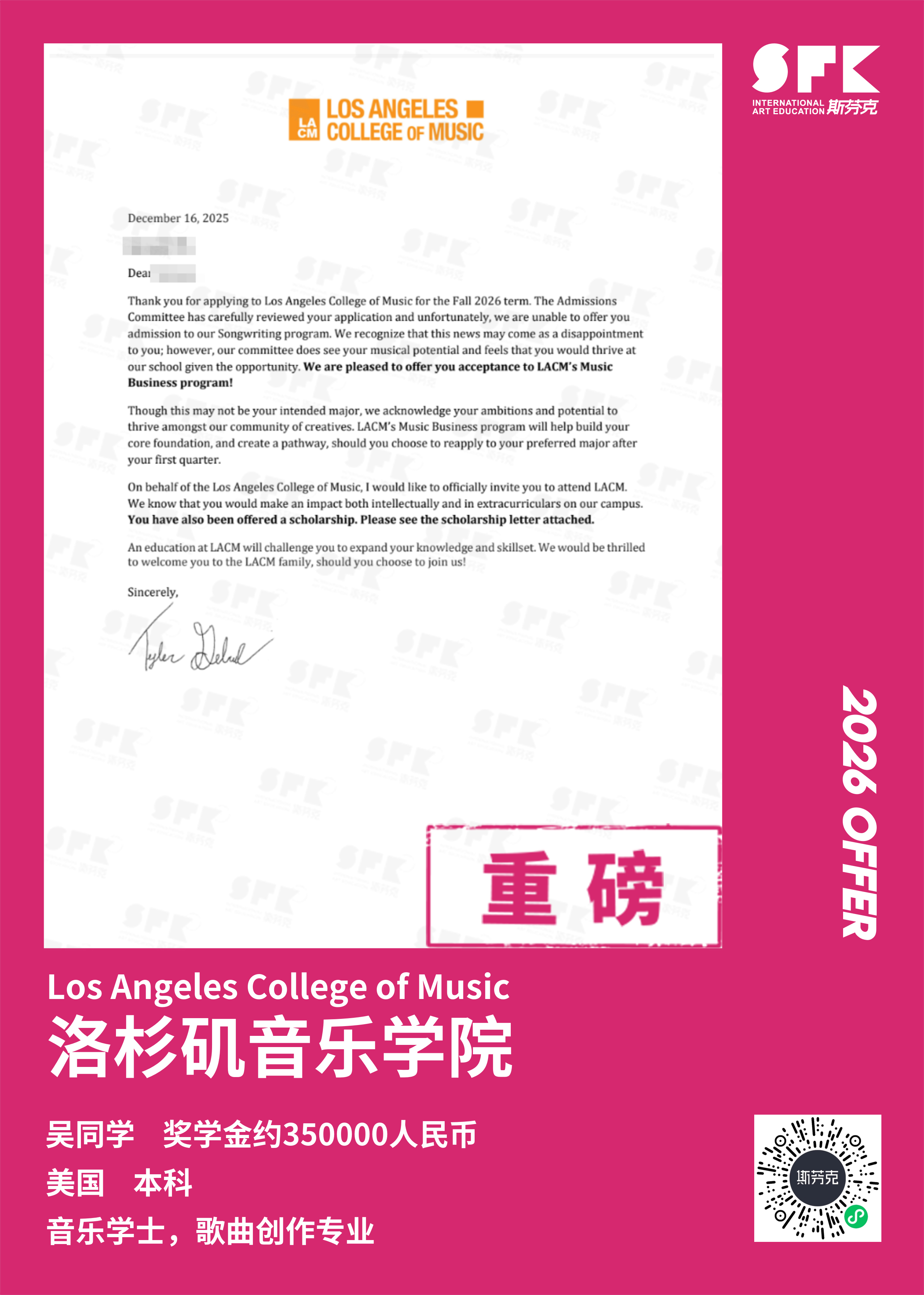 斯芬克音乐已帮助学员获得越来越多的国外音乐院校Offer
