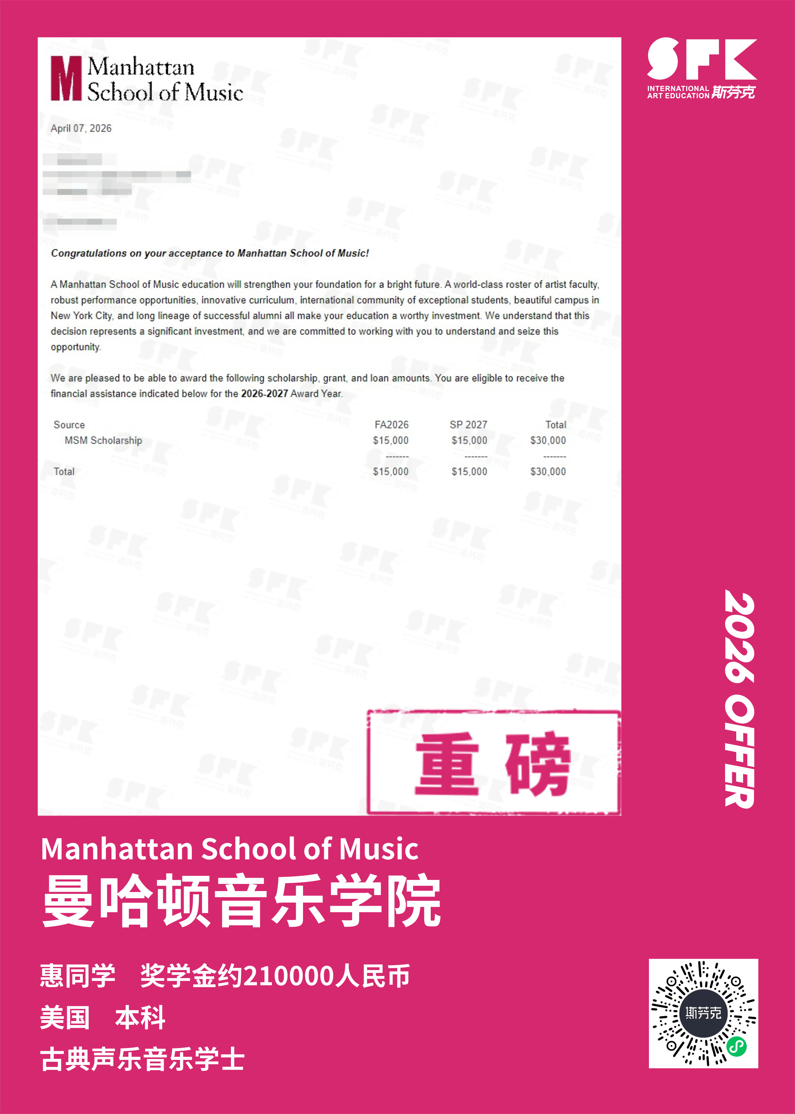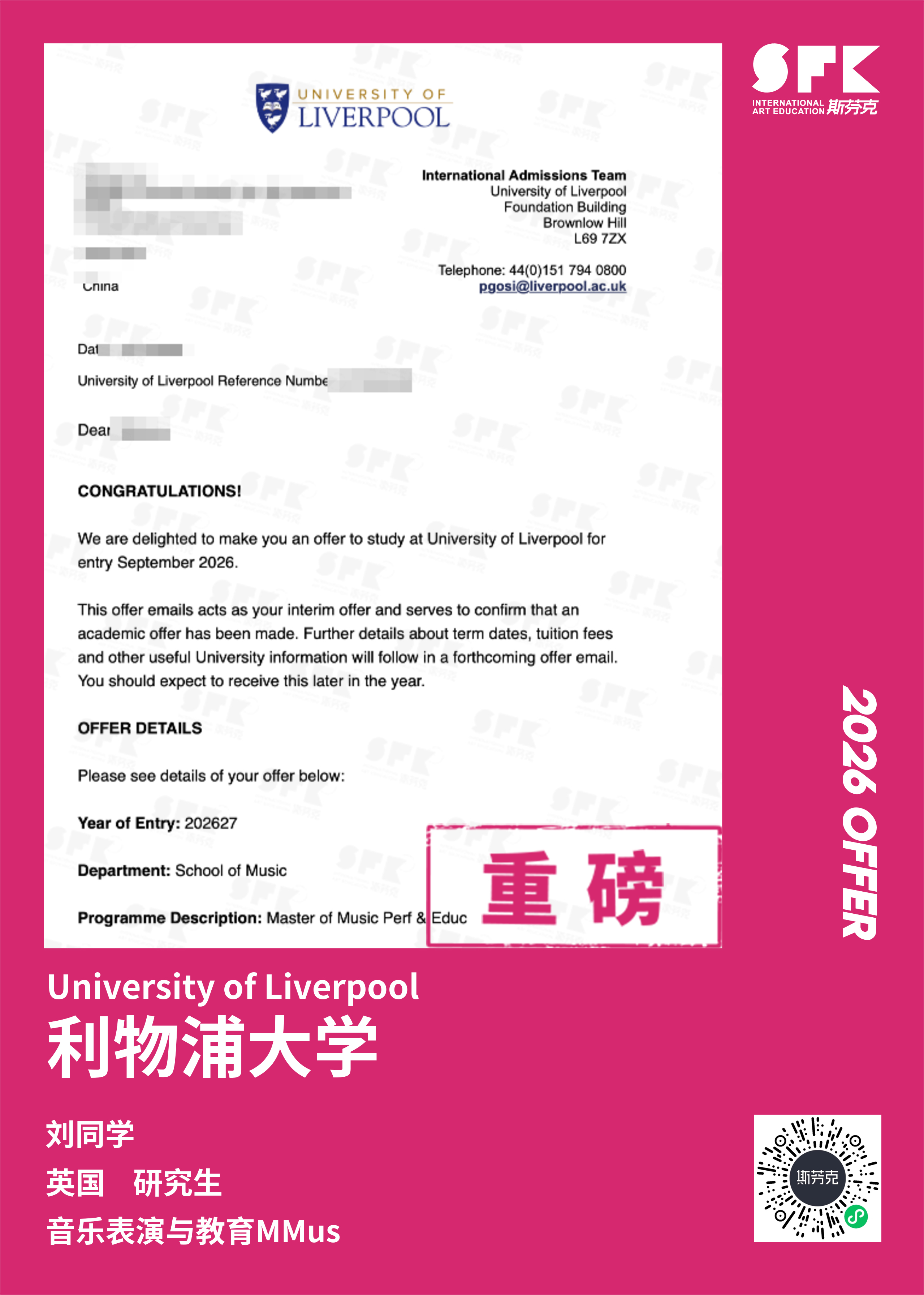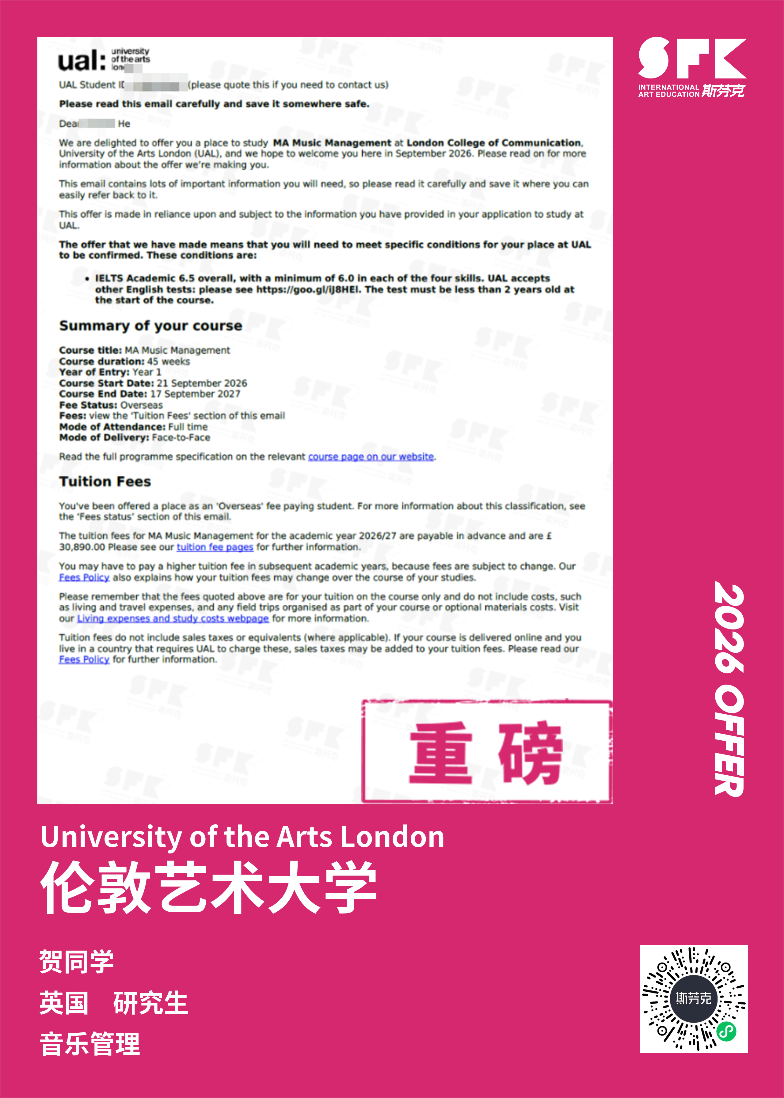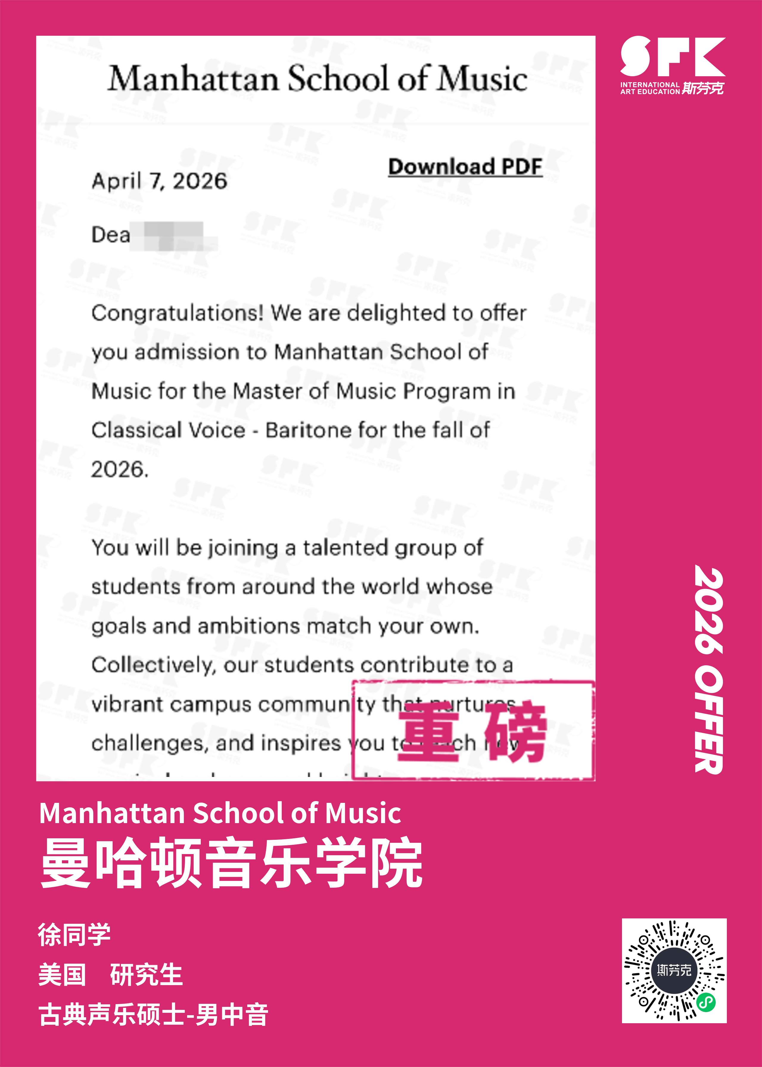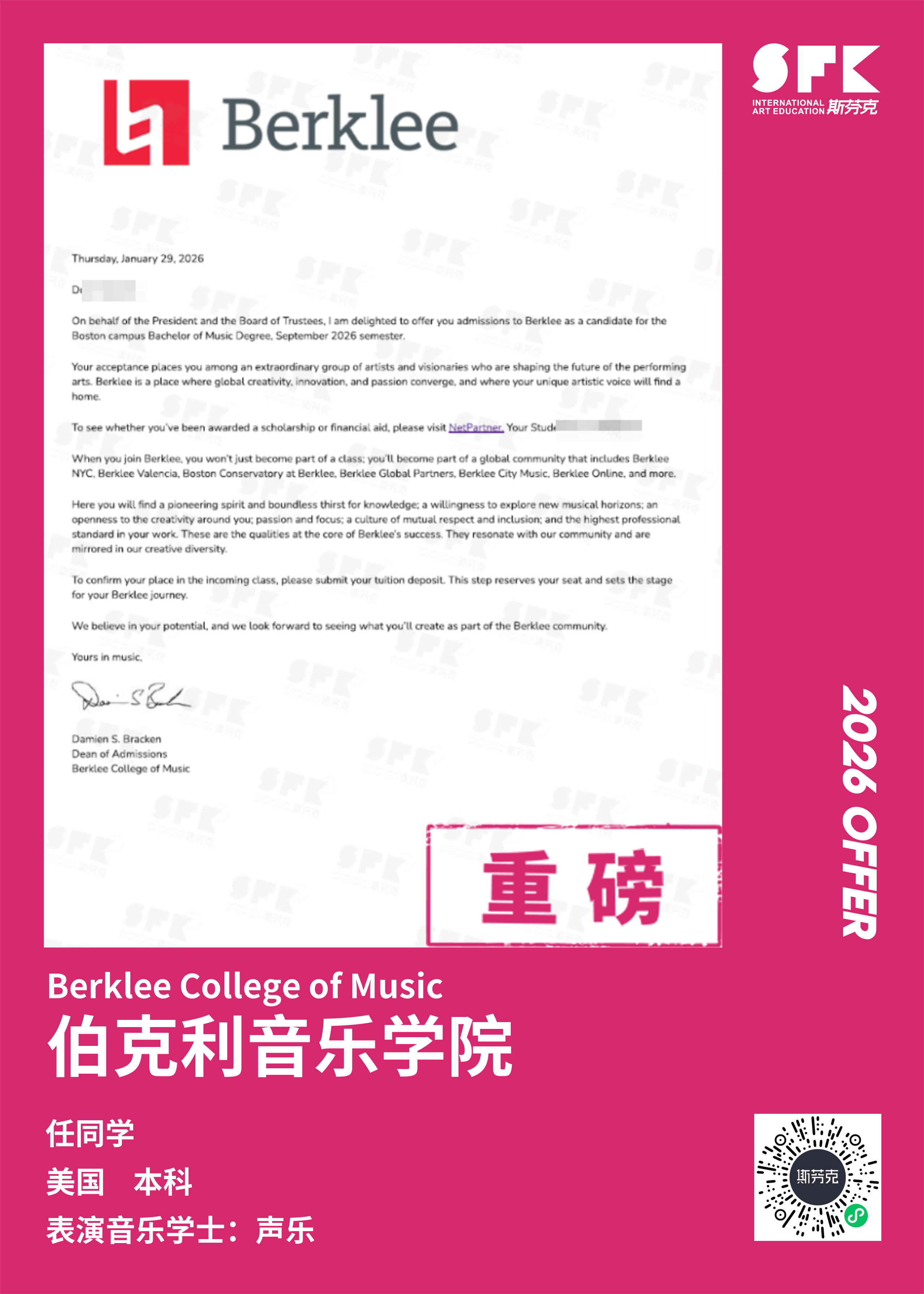 斯芬克音乐已帮助学员获得越来越多的国外音乐院校Offer