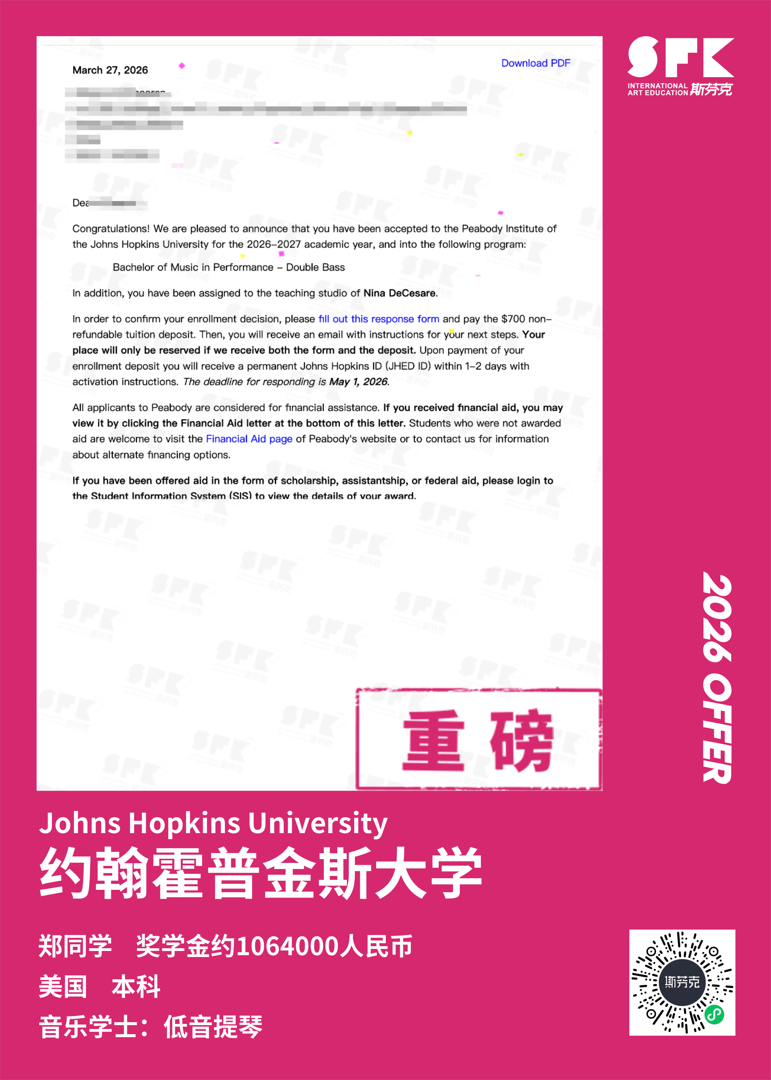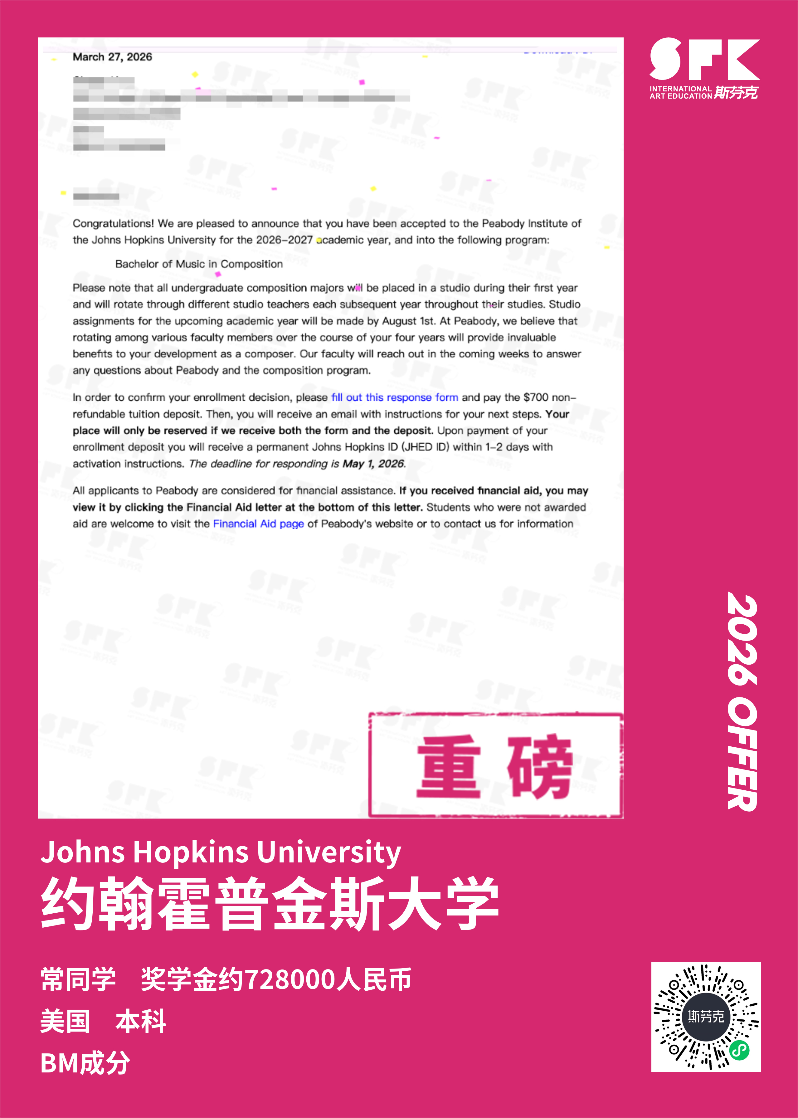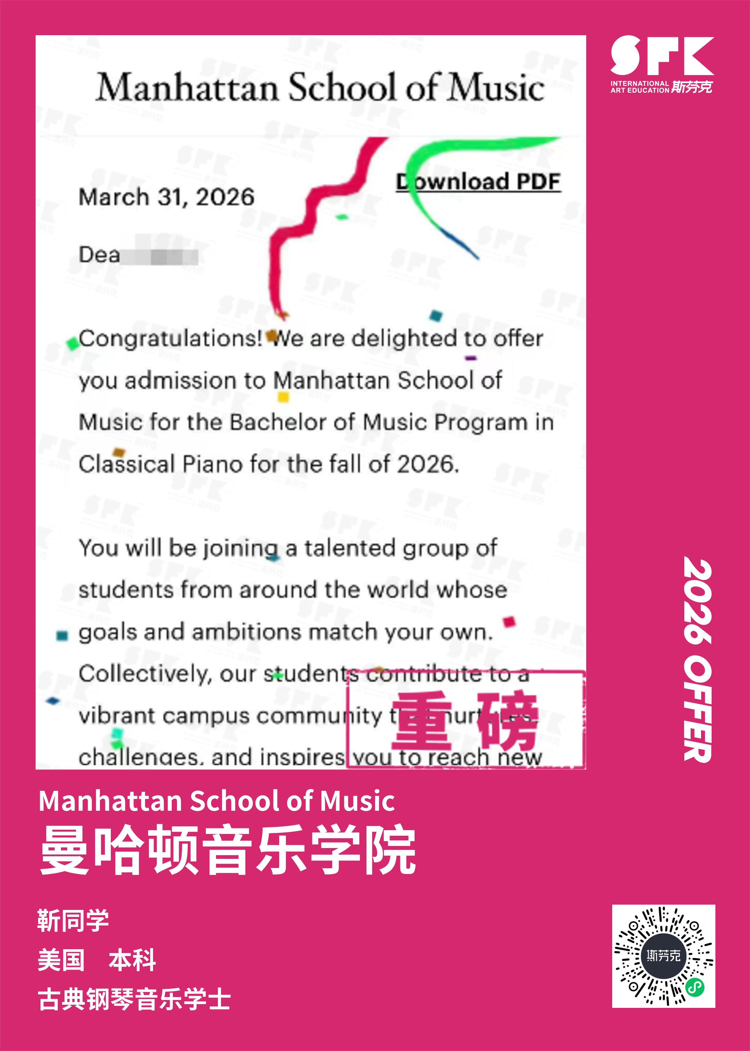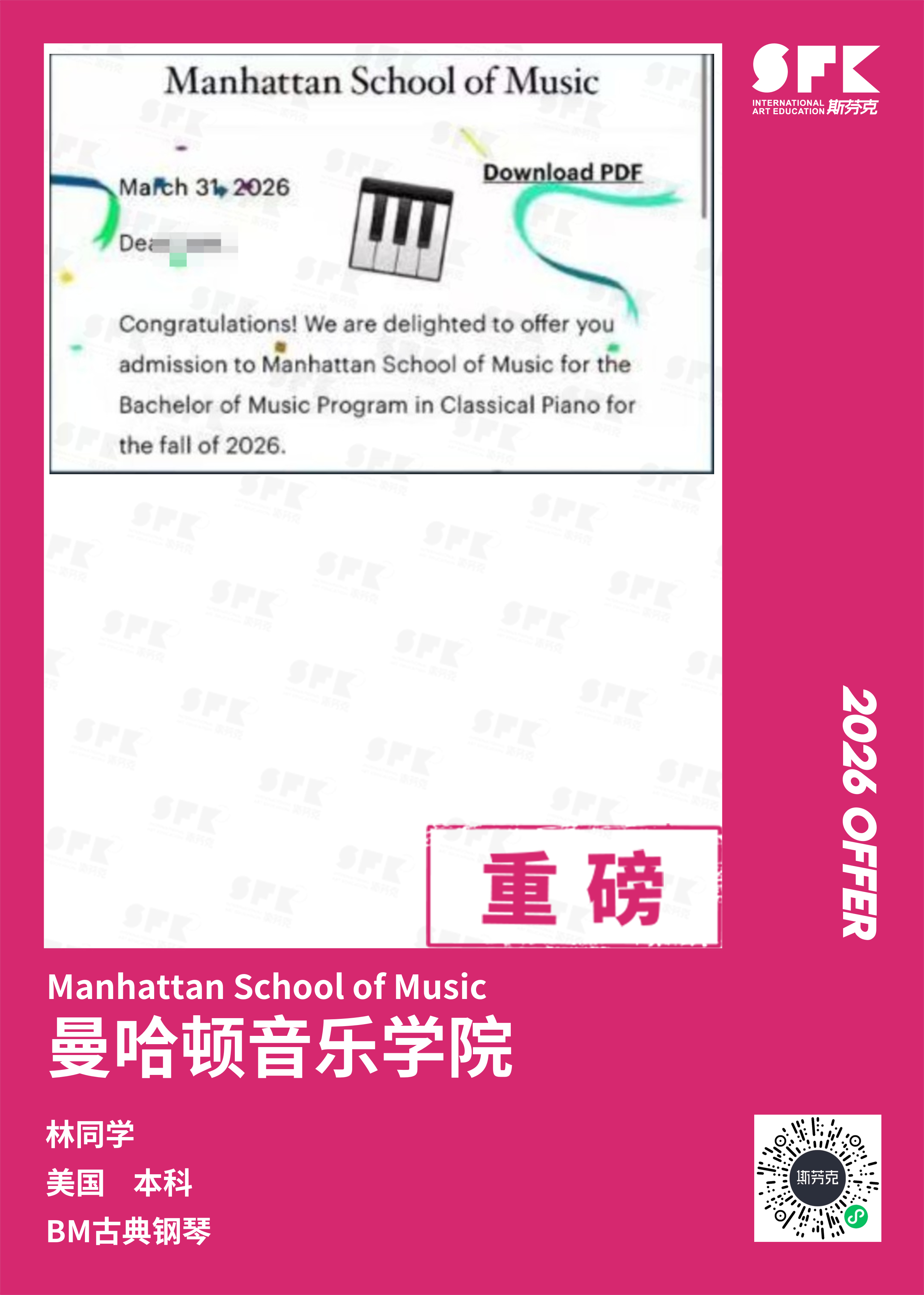 斩获约翰霍普金斯大学、耶鲁大学、西北大学、纽约大学等综合大U音乐学院Offer