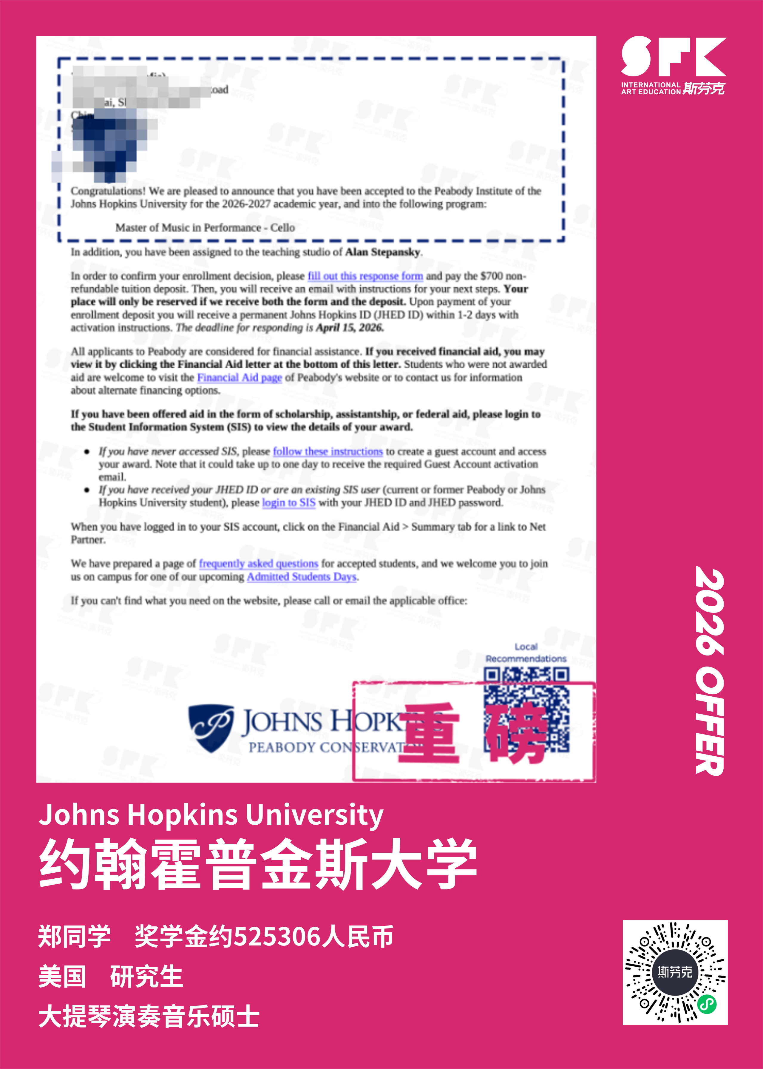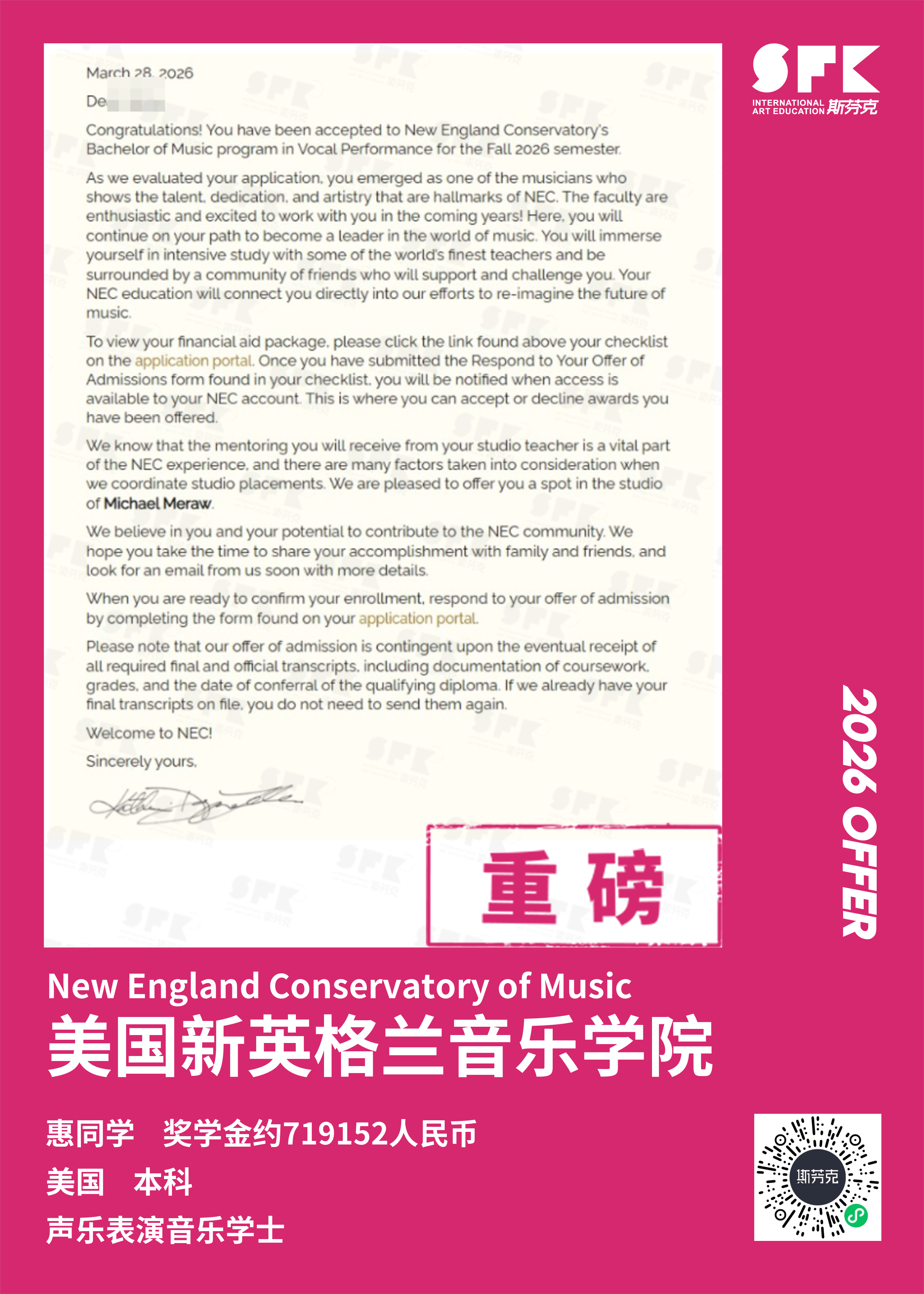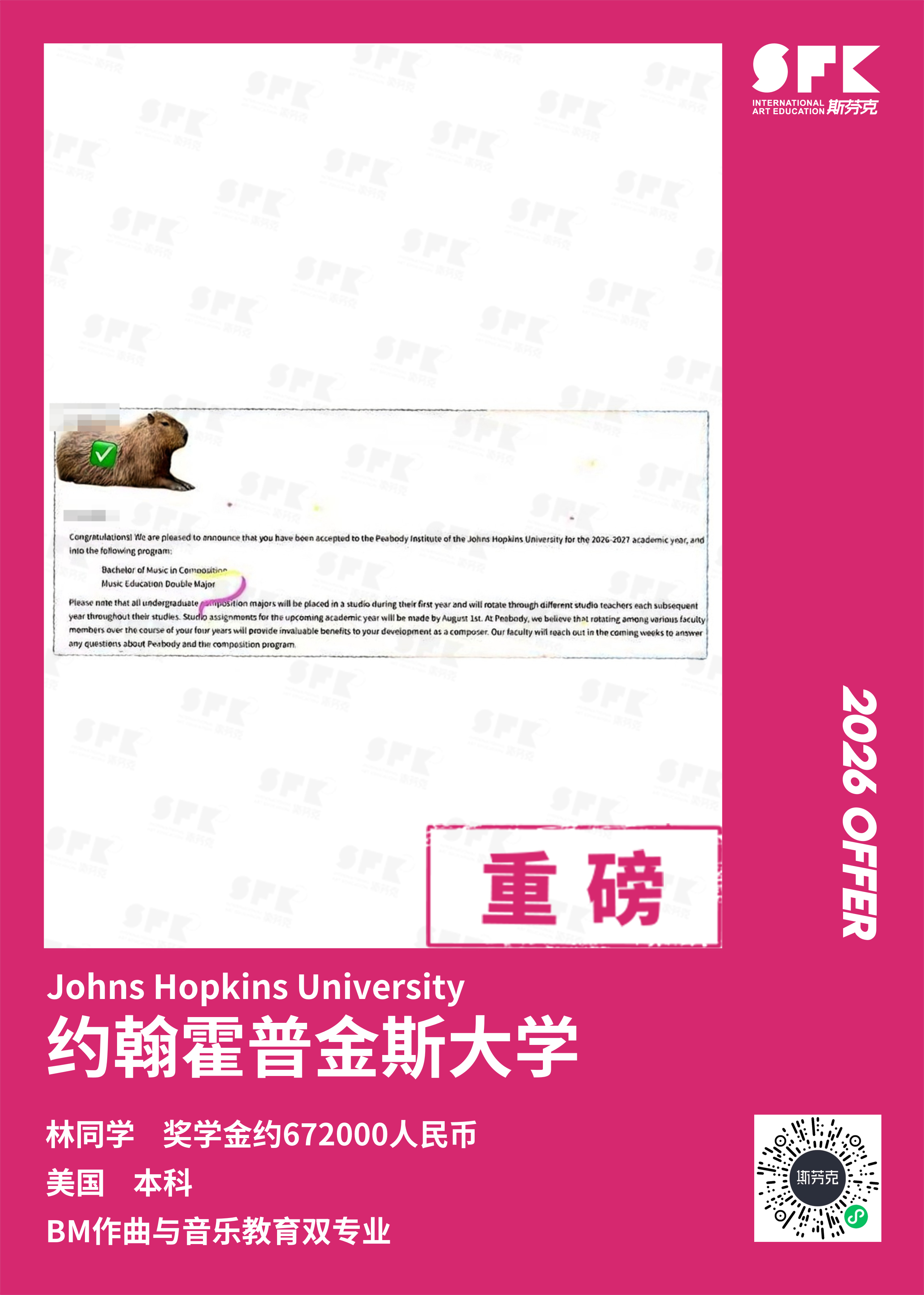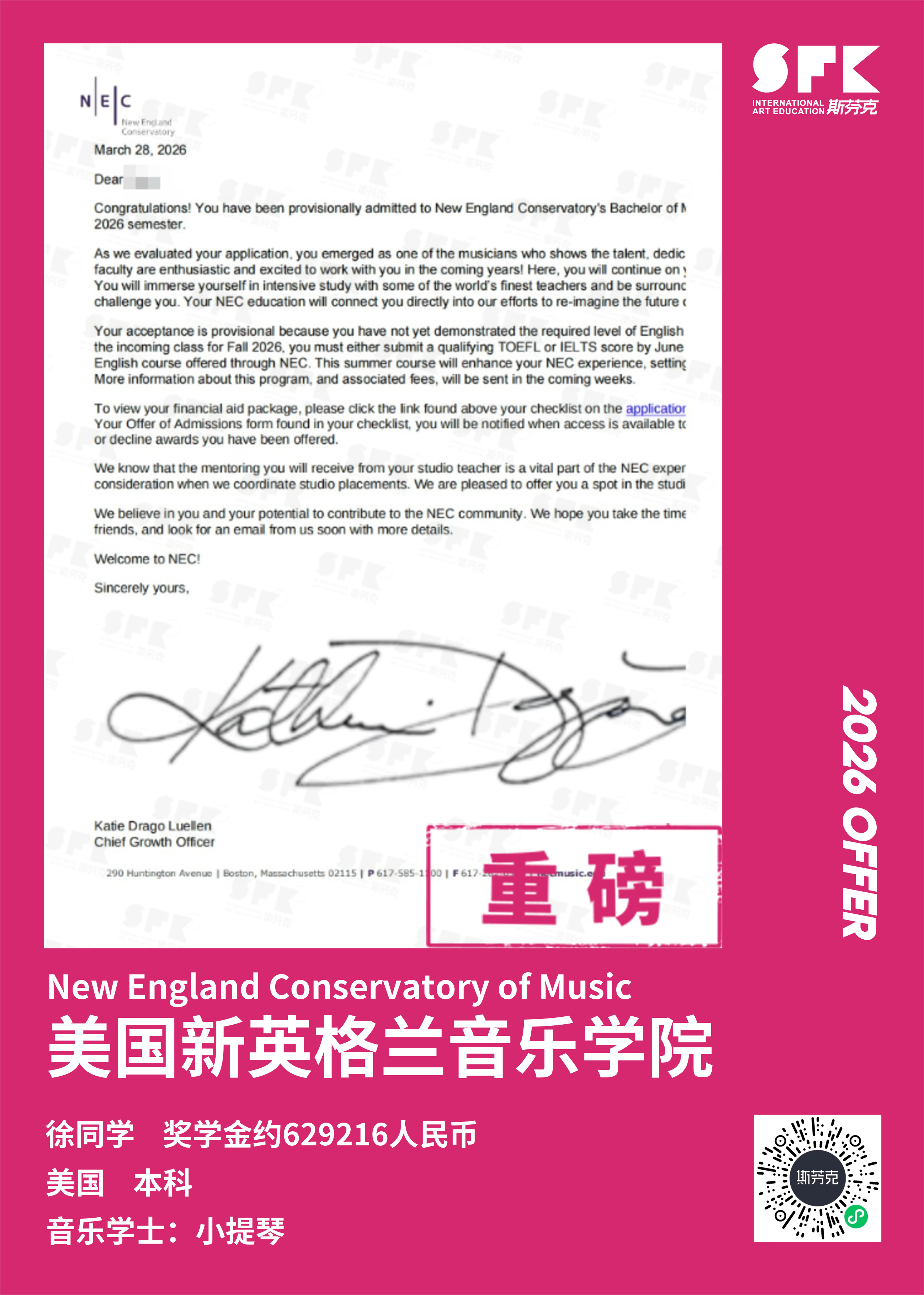 斩获约翰霍普金斯大学、耶鲁大学、西北大学、纽约大学等综合大U音乐学院Offer