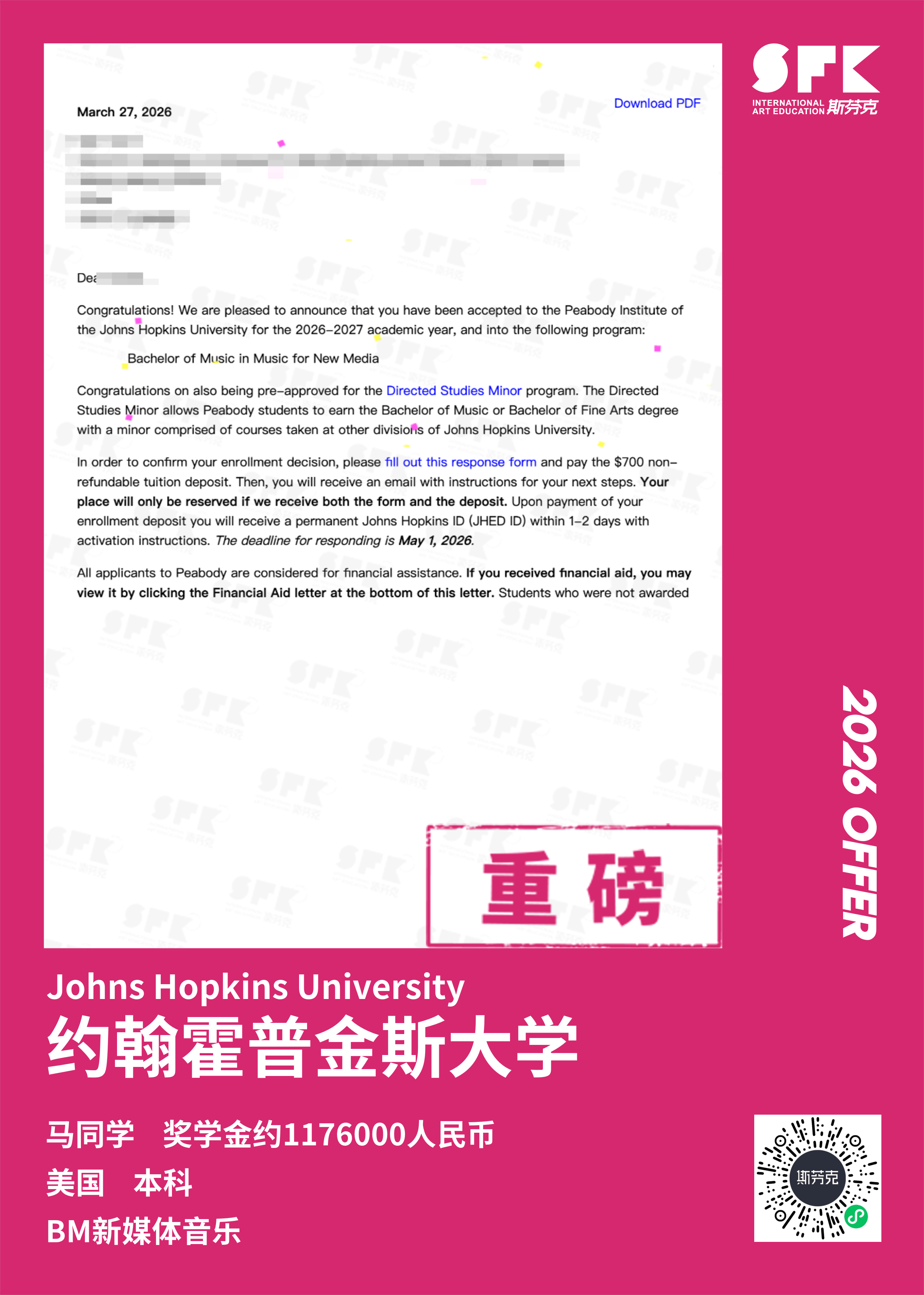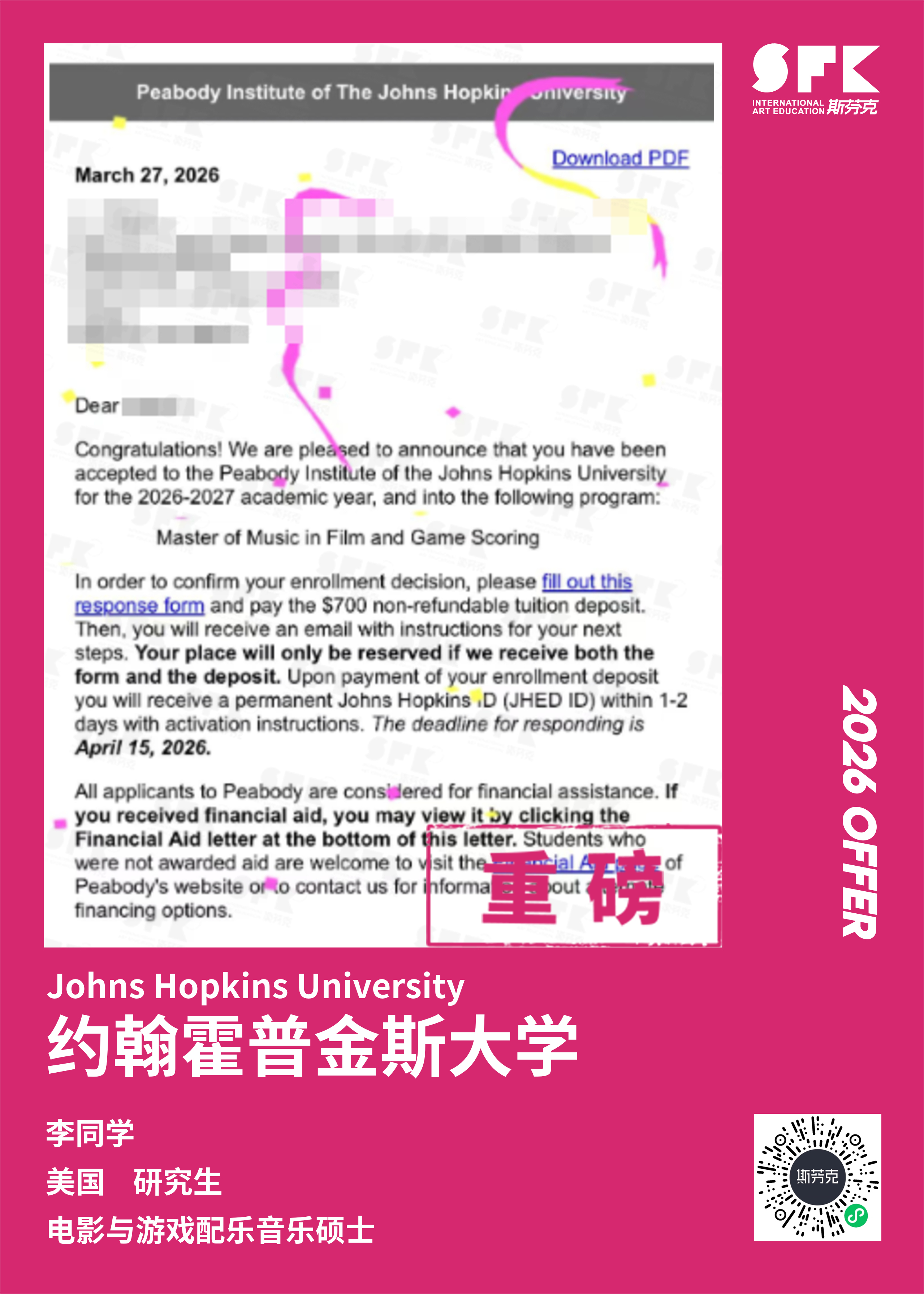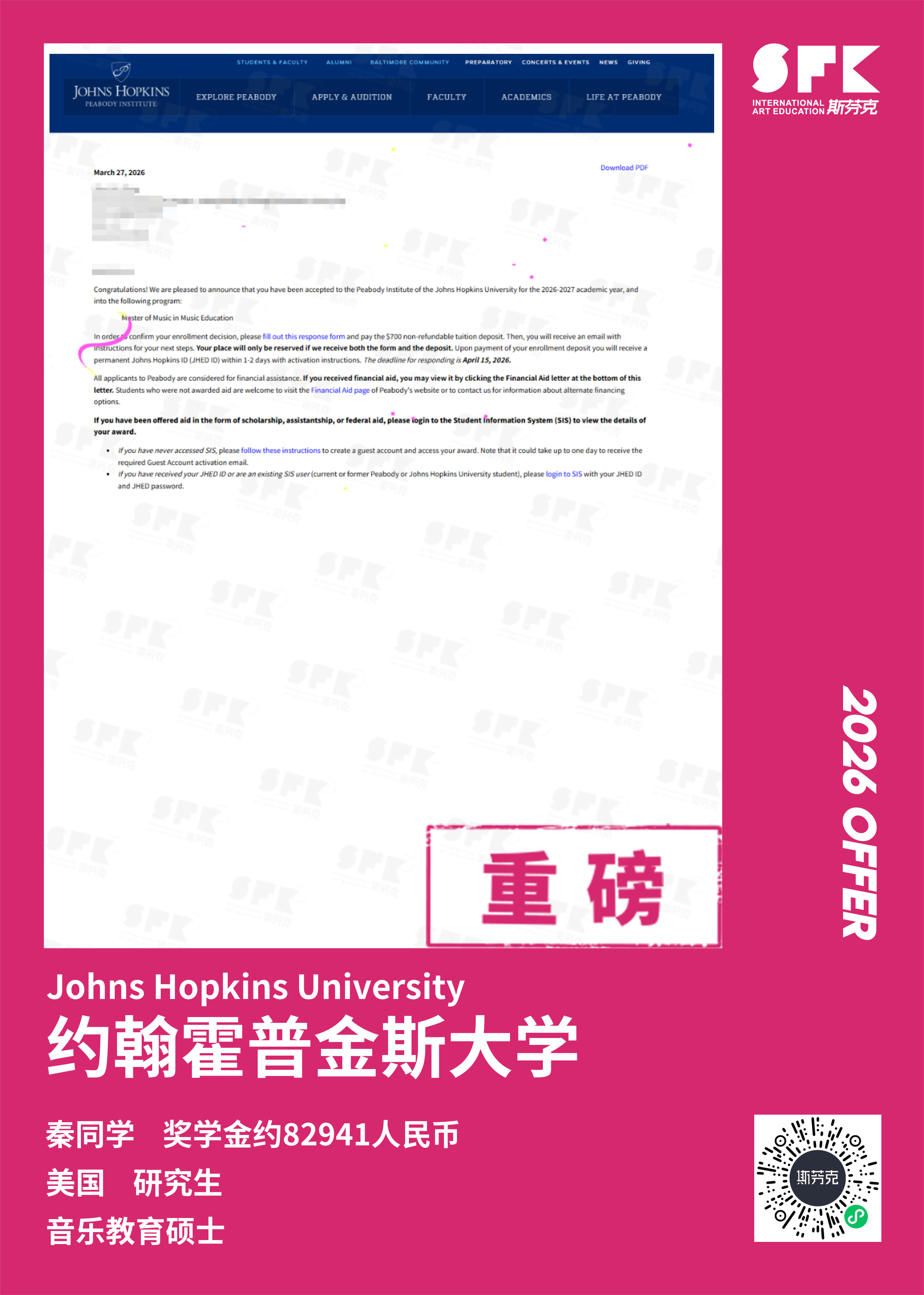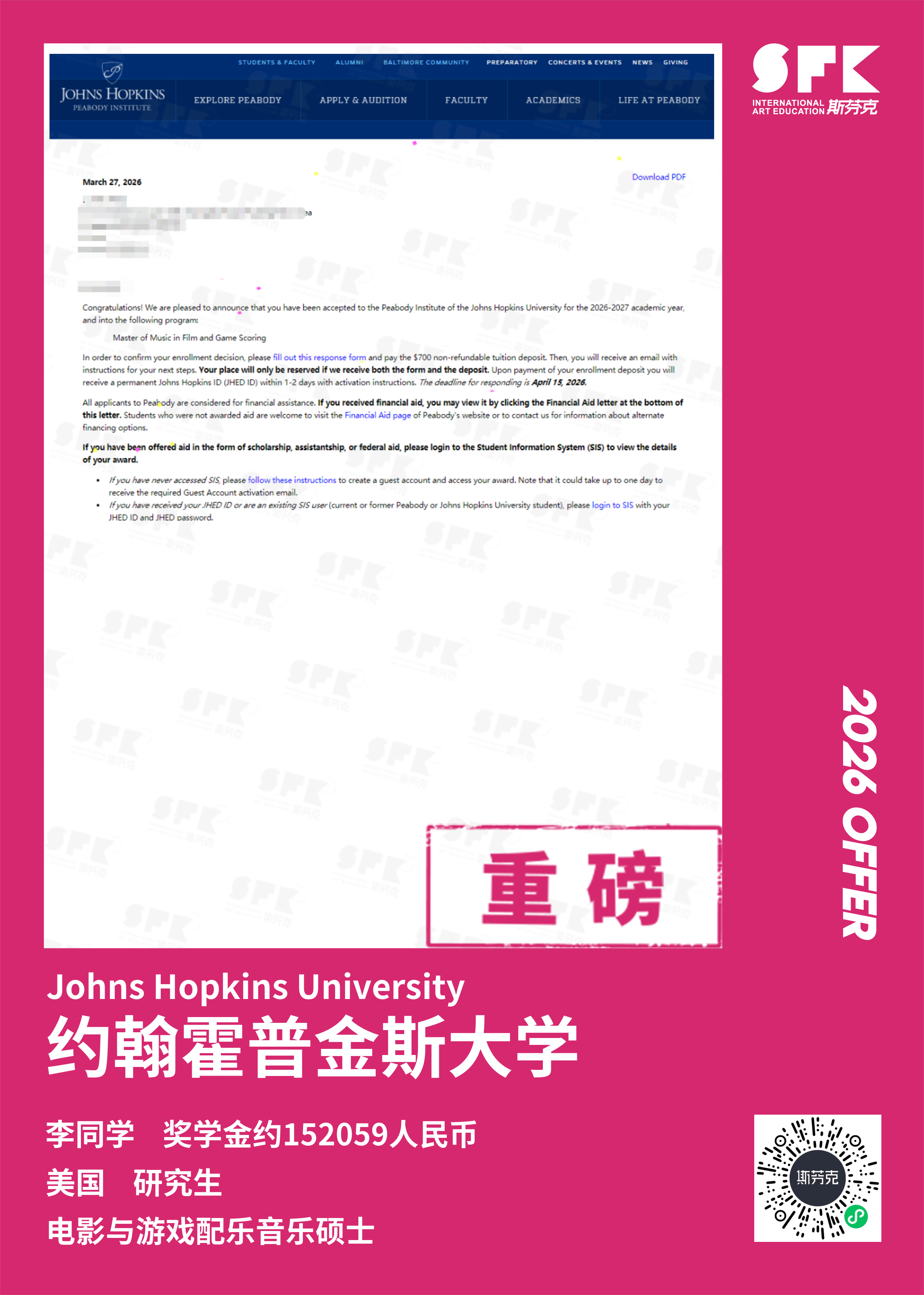 斩获约翰霍普金斯大学、耶鲁大学、西北大学、纽约大学等综合大U音乐学院Offer